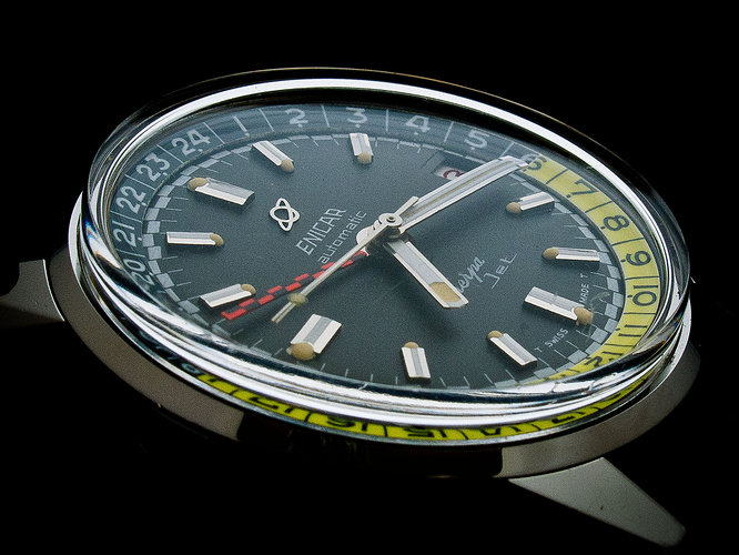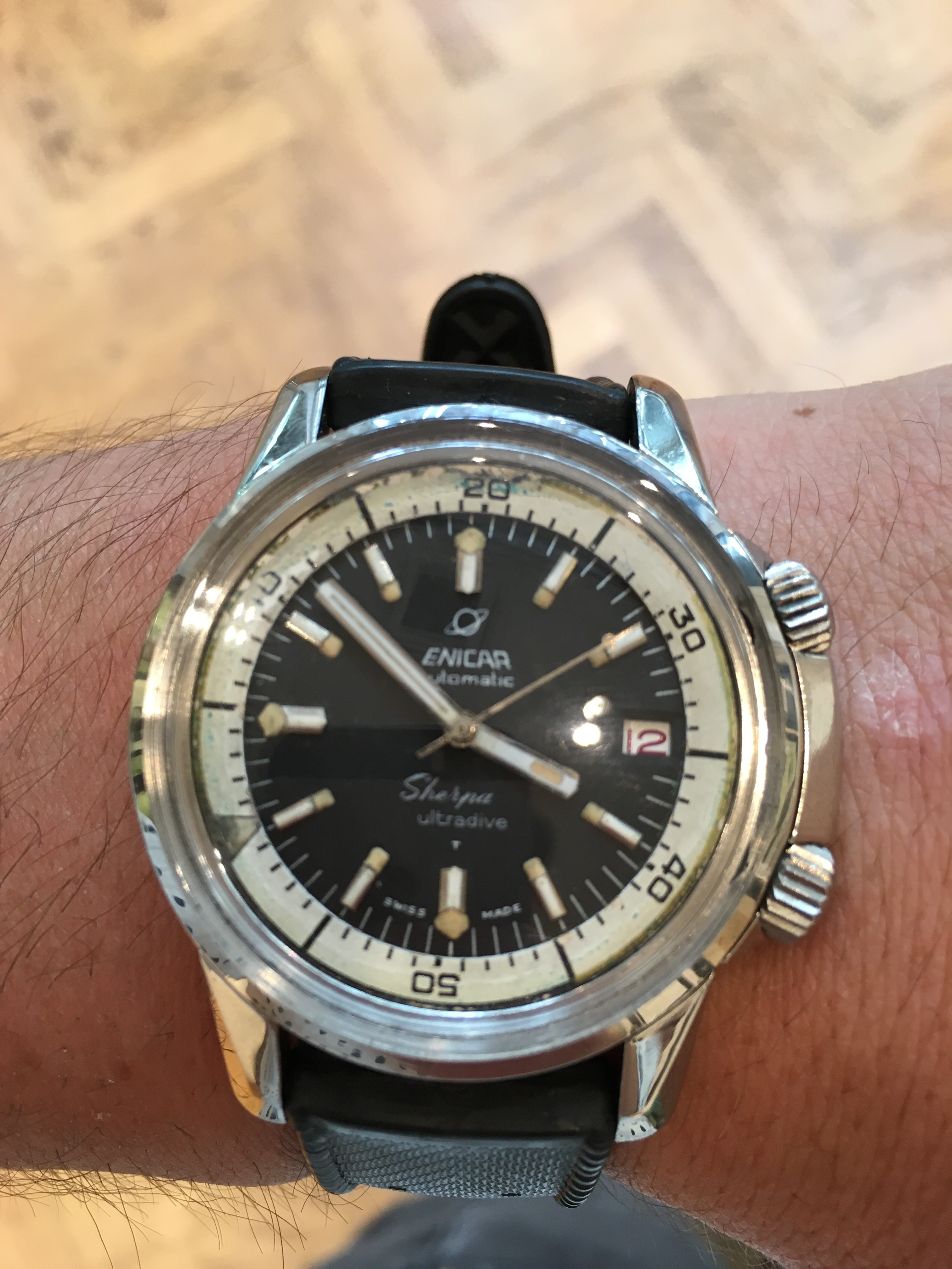 Wat mij opvalt is dat de lume op de Enicar modellen vaak erg slecht is, volledig vergaan of simpelweg zwart (weg?) is. Erger dan horloges met tritium uit dezelfde periode.