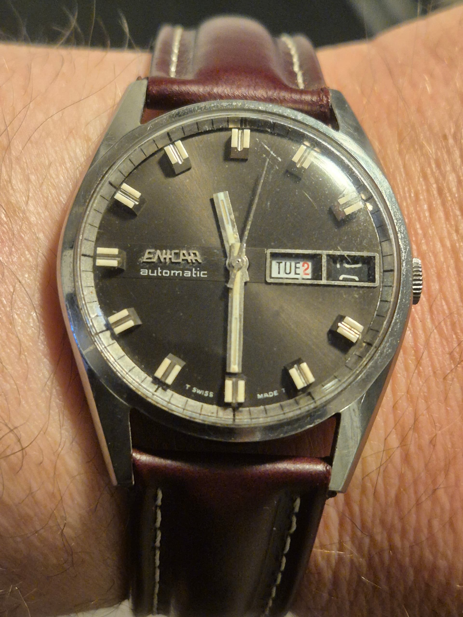 Toevallig vandaag ook een Enicar om, eentje, die je niet heel vaak ziet. Een Enicar Ocean Pearl met een prachtige donkerbronzen wijzerplaat.