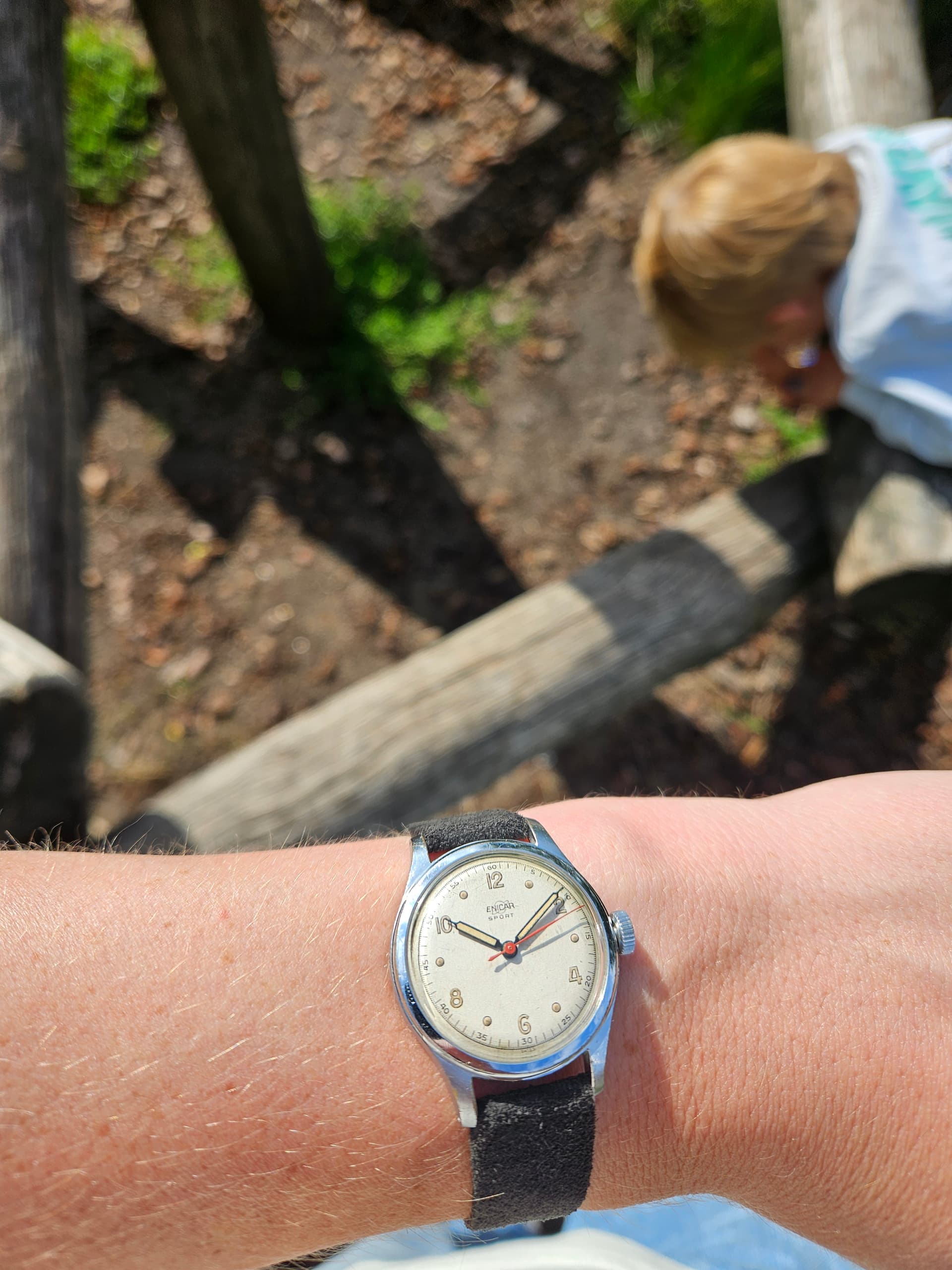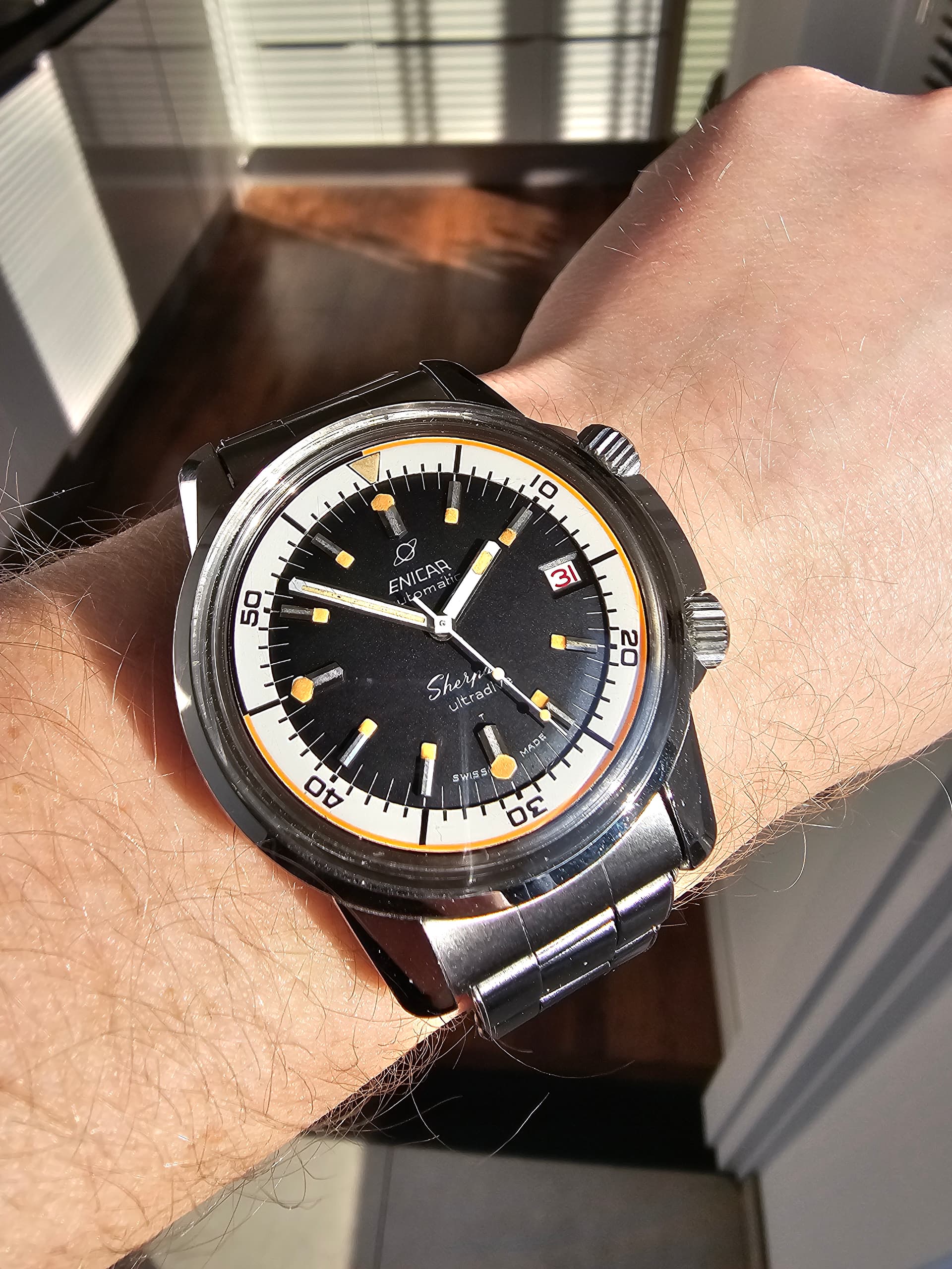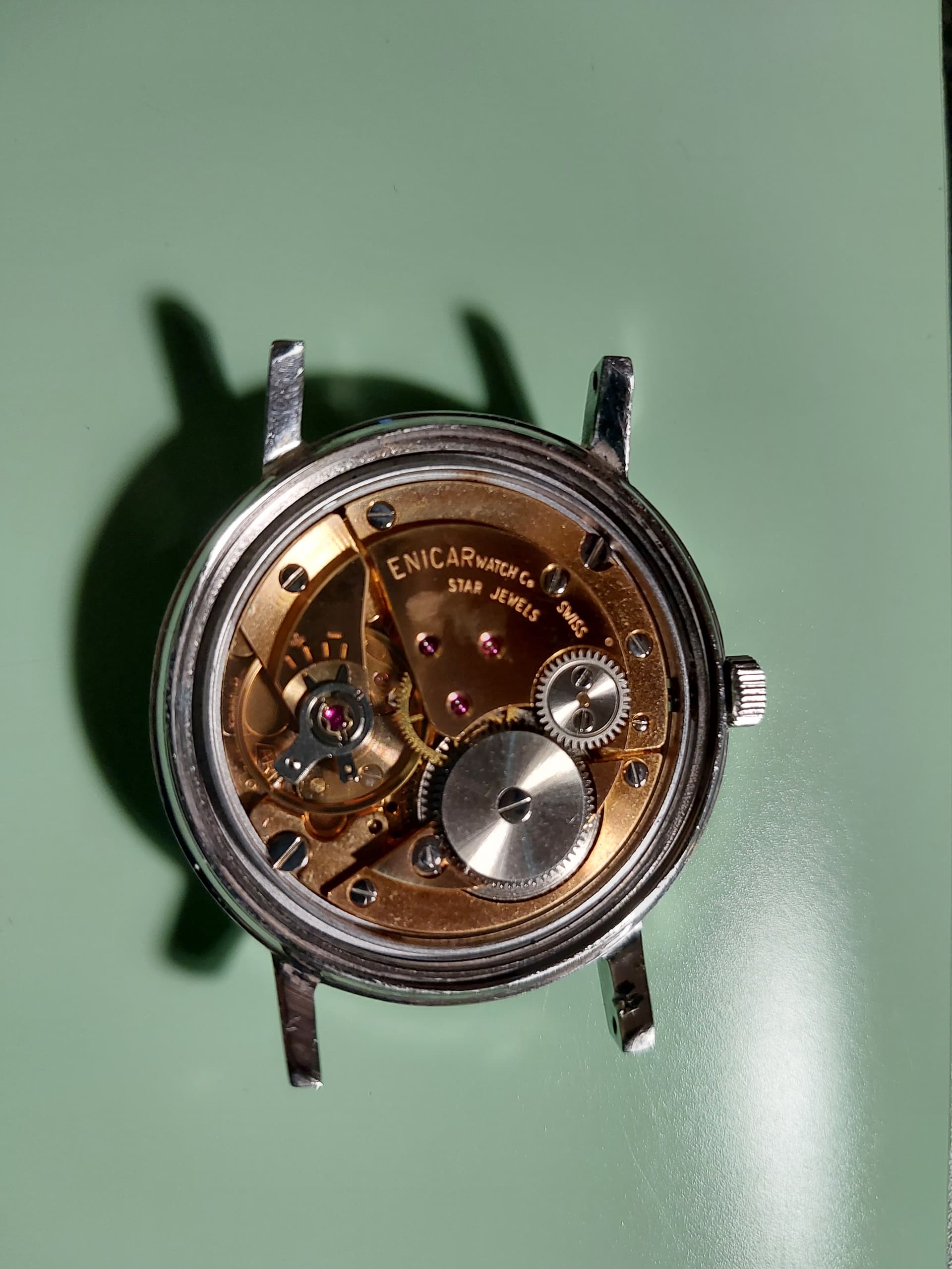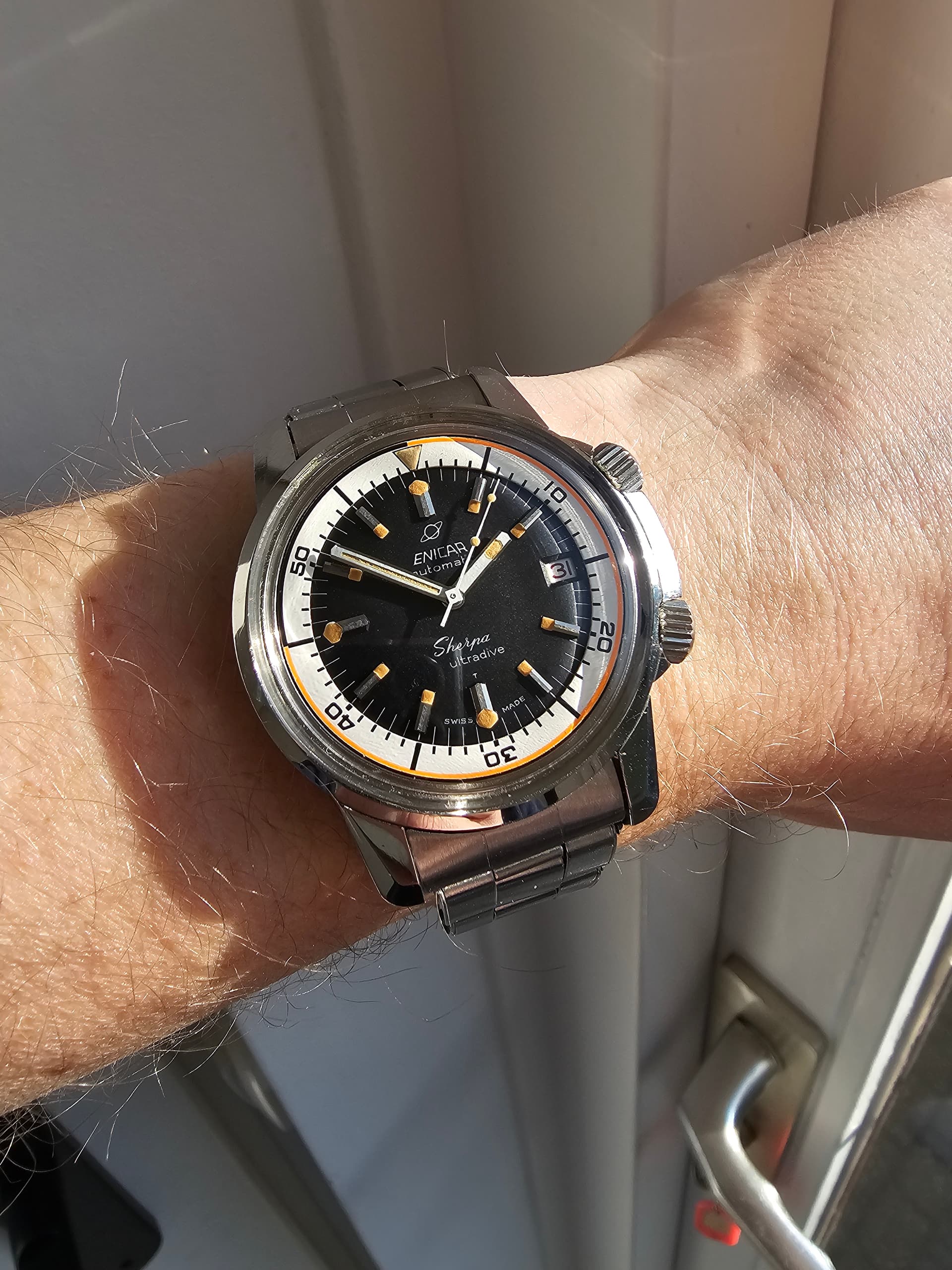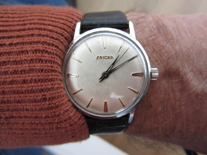 Twintig jaar geleden een van mijn mooiste Enicar dials (Guide) in een passende stalen Enicar kast laten monteren - loopt prima hoor en ziet er goed uit ook