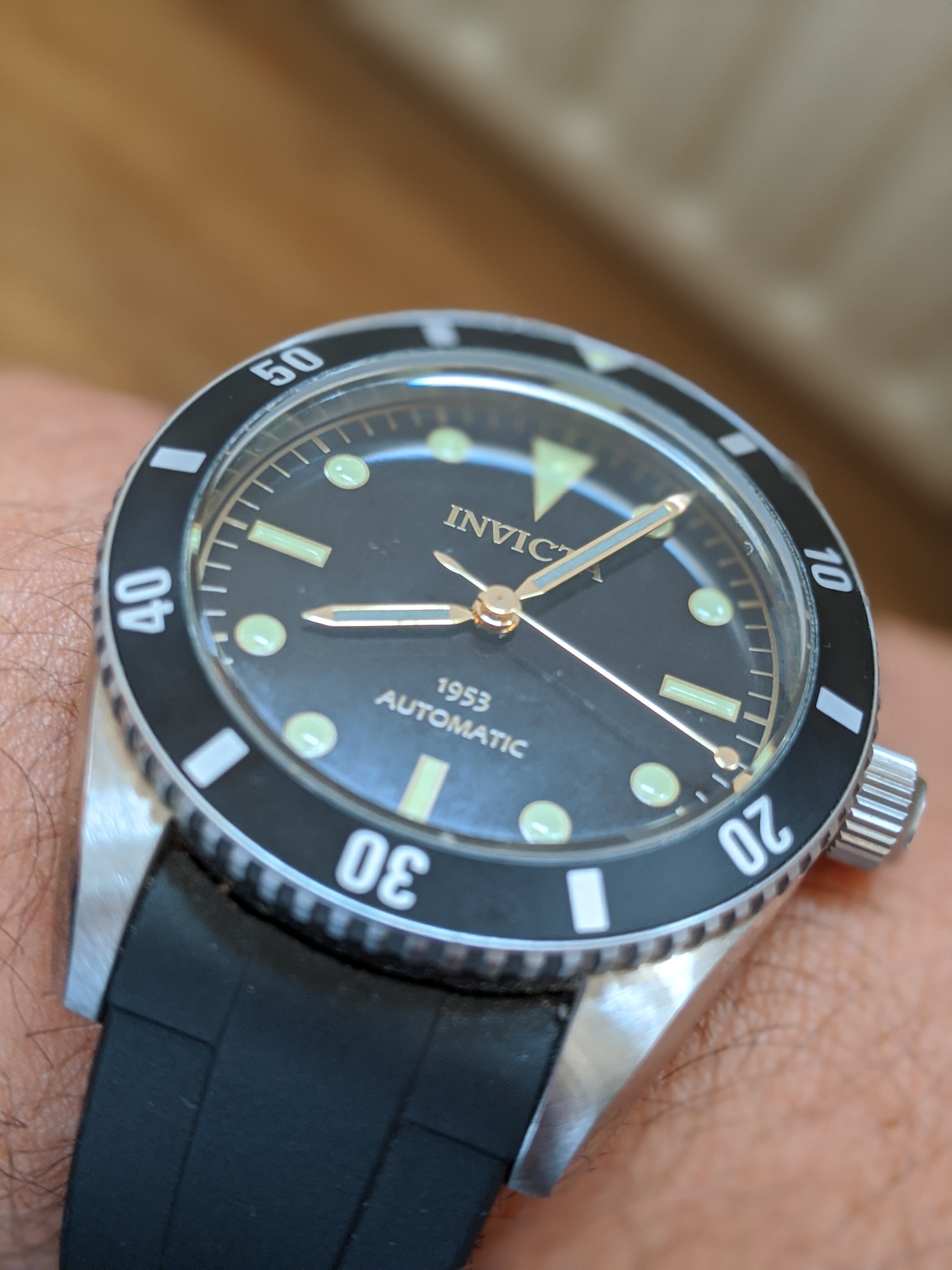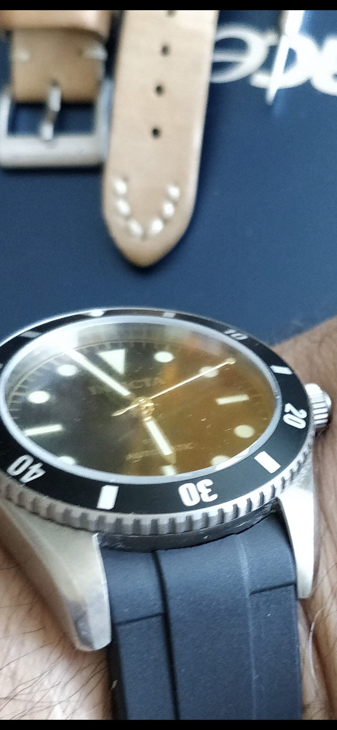 Geen enkele spijt gehad van deze aankoop. Gaat met grote regelmaat om de pols na het werk en in het weekend. Hij draagt lekker licht ook, zeker op rubber.