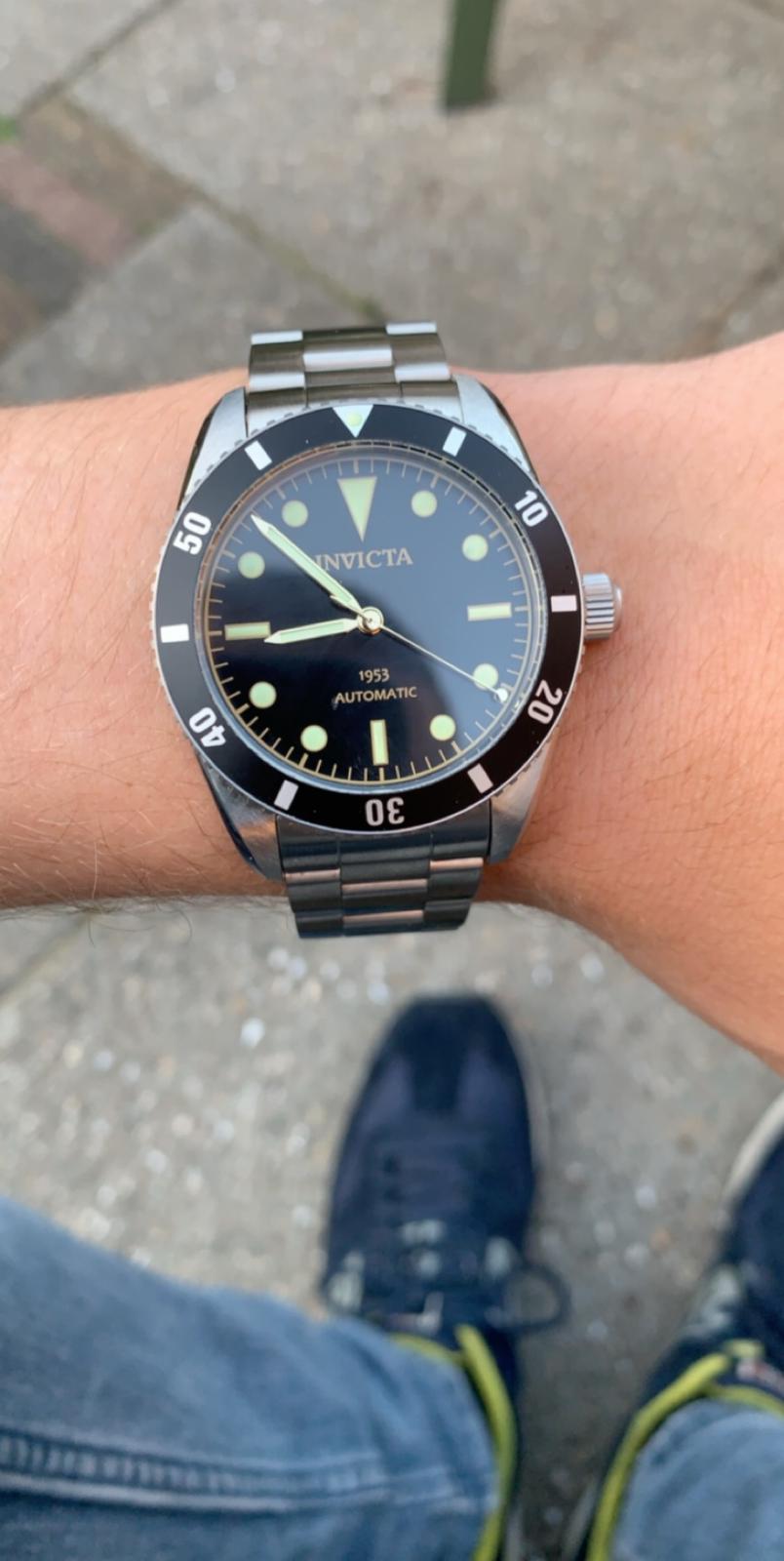 Hij had eerst een voor mij oerlelijke 45mm “gouden” Invicta. Was ie erg blij mee tot ie m verloor. Nu die deze omheeft: Dit ziet er toch veel mooier uit!!