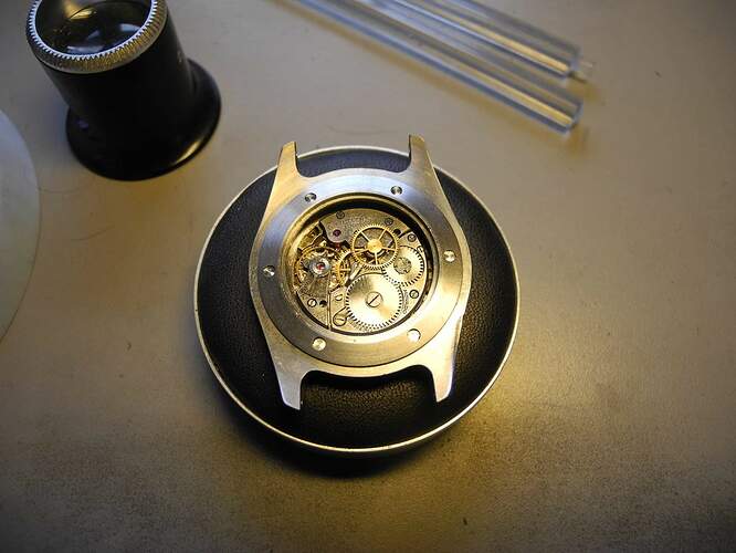 EDIT: Dit is een foto van work in progress. Later is het uurwerk nog geüpgraded door Jan met geblauwde schroeven.