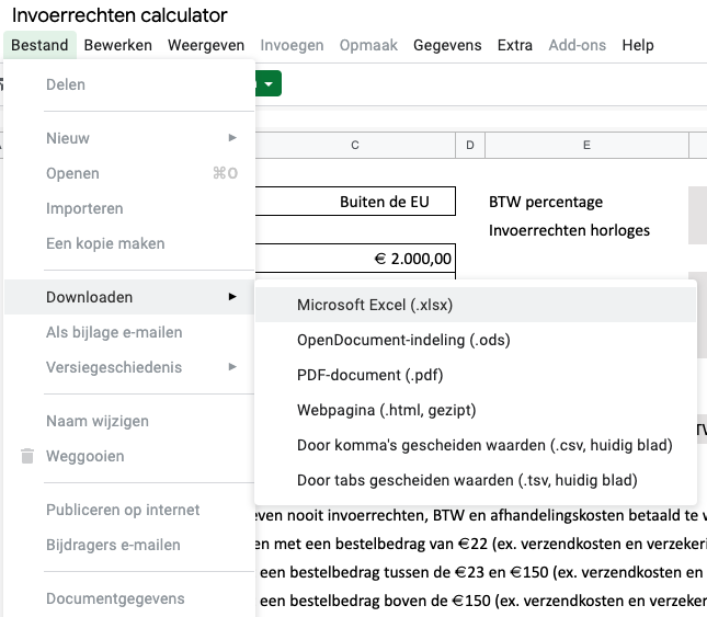 Als je geen Excel hebt of niks wilt downloaden zijn er ook genoeg websites die een soort gelijke calculator hebben, google maar eens op invoerrechten calculator.
