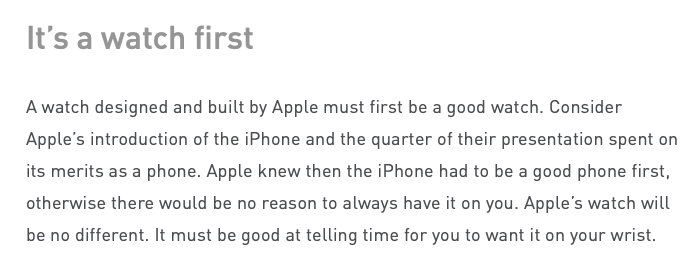 Hoofdfunctie van een horloge is weergave van de tijd, de Applewatch is ontworpen om dat als primair doel te hebben, met daaromheen tal van complicaties en apps als aanvulling.