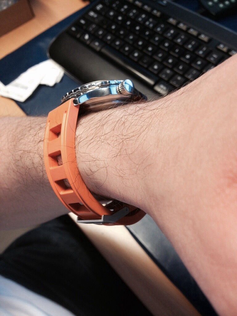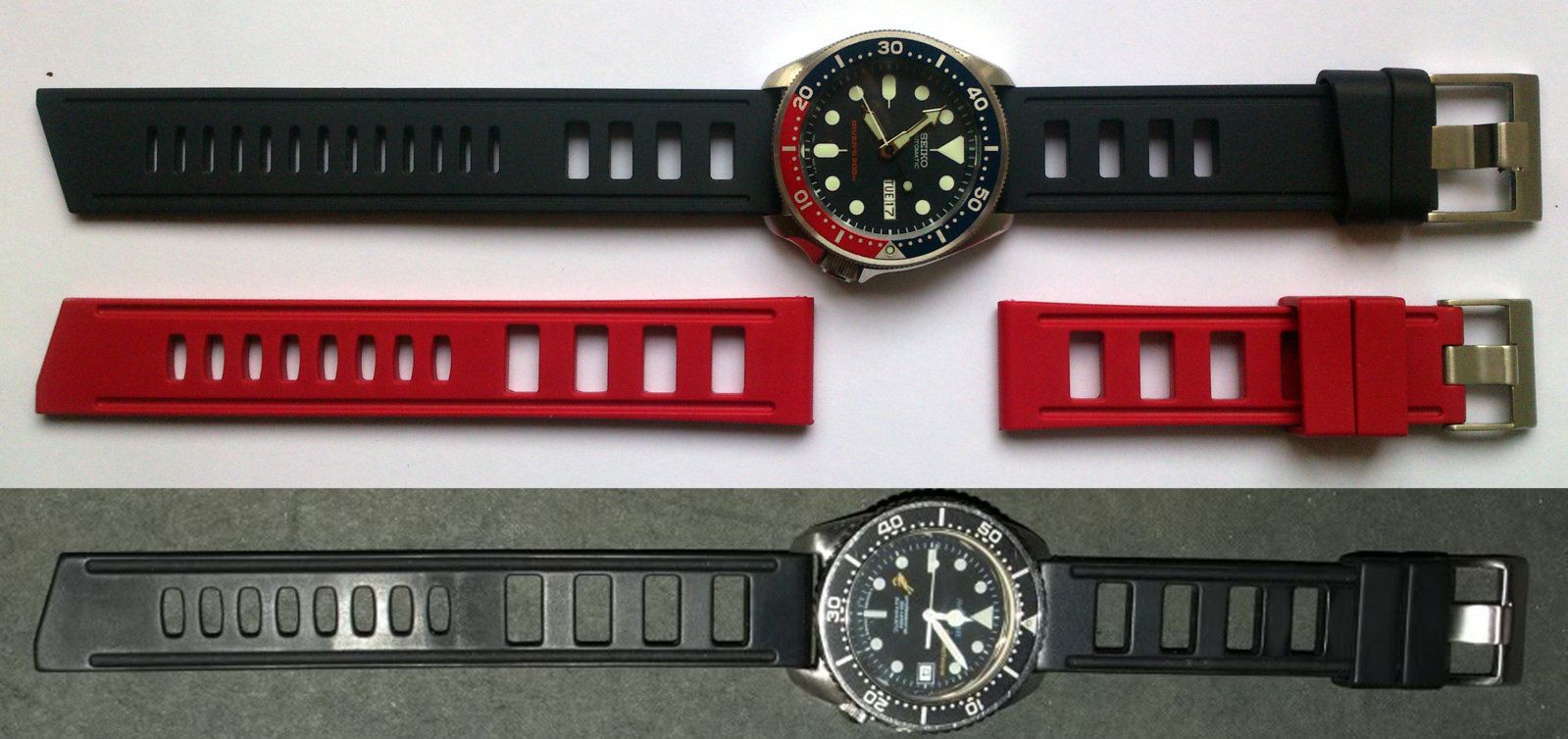 Volgens mij net andersom, een Isofrane is beter geschikt voor smallere polsen. Onderstaand zie je het verschil goed tussen een Isofrane (zwart) en Obris Morgan (rood). De gaten zijn bij de Isofrane kleiner en er zitten er meer over een groter oppervlak. De onderste band is van Timefactors (UK), kost echt geen drol maar is een drama…