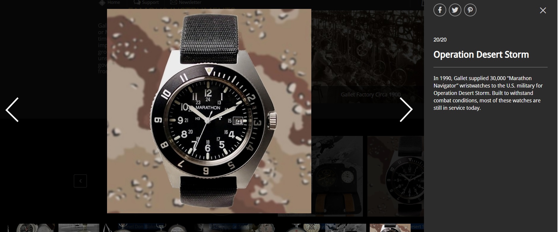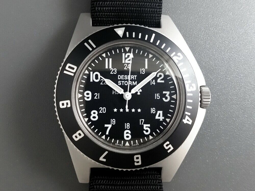 Naar wat ik op internet las (en waarvan ik dus niet weet of het echt waar is) zou Gallet 6 prototypes aan het Amerikaanse leger hebben geleverd met de naam desert storm er op. De VS verwierpen die en kozen voor de naam Marathon (wat al een heel oude handelsnaam van Gallet was). Over de reden van het verwerpen bestaan verschillende versies. Van de 6 prototypes zouden er 5 bekend zijn. Zeer zeldzaam en kostbaar, want door verzamelaars gewild. De kans dat je een echte hebt zal niet erg groot zijn. De kans dat er een homage in grotere oplage aan is uitgebracht, of mogelijk een reissue door Marathon zelf (ik ben verder niet goed thuis in het merk) lijkt me gezien de vraag wel groot.