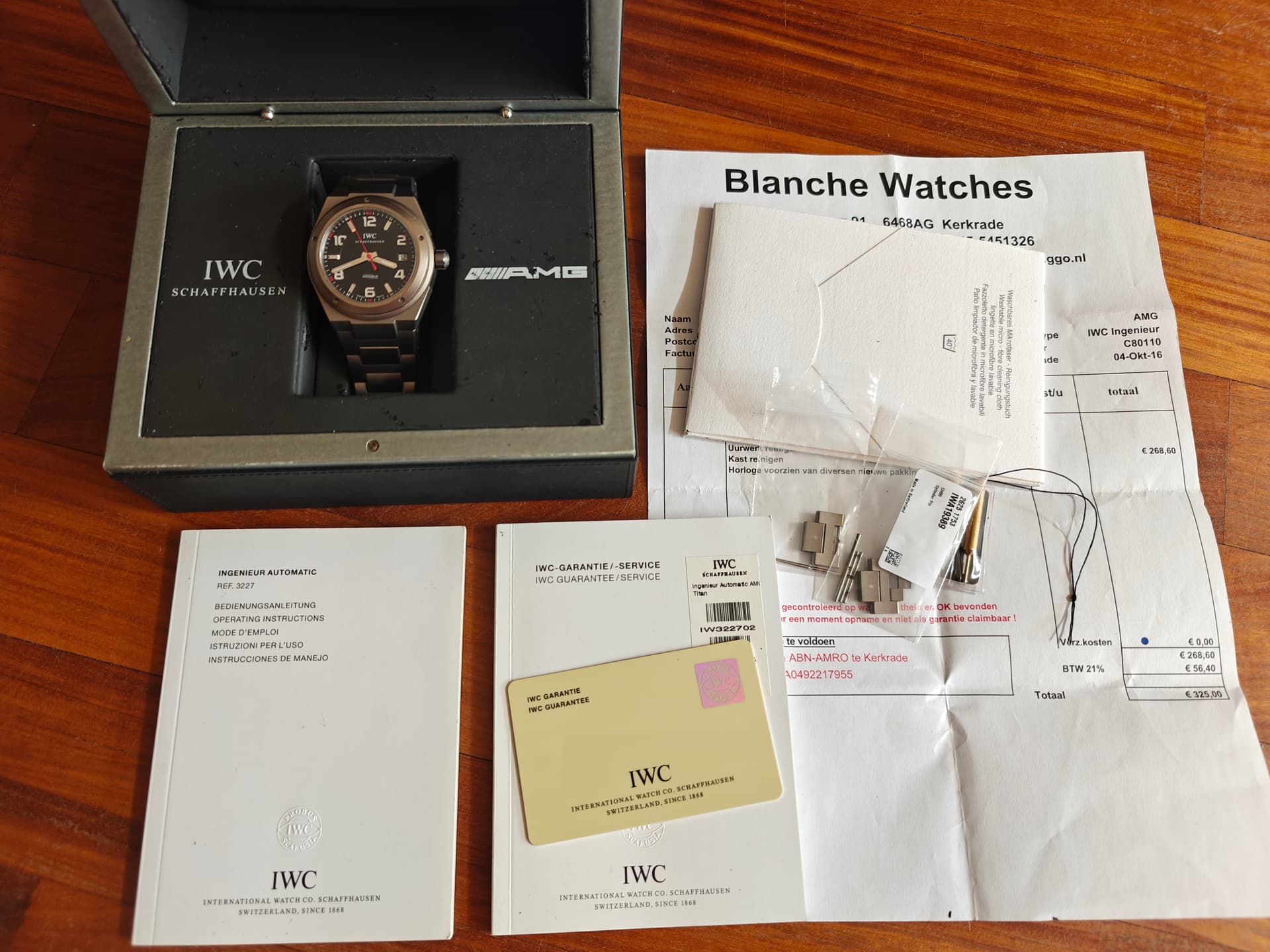 Originele doos en/of eventuele accessoires: doos, boekjes etc, 2 hele en een halve schakel extra en de pushers voor het wisselen van schakels.