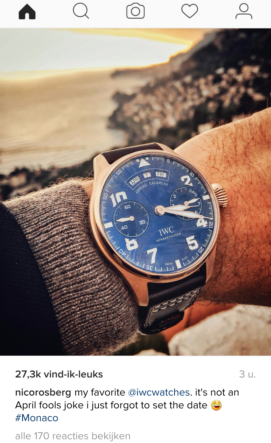 De IWC van Nico Rosberg @instagram (met de datum op 1 april…)