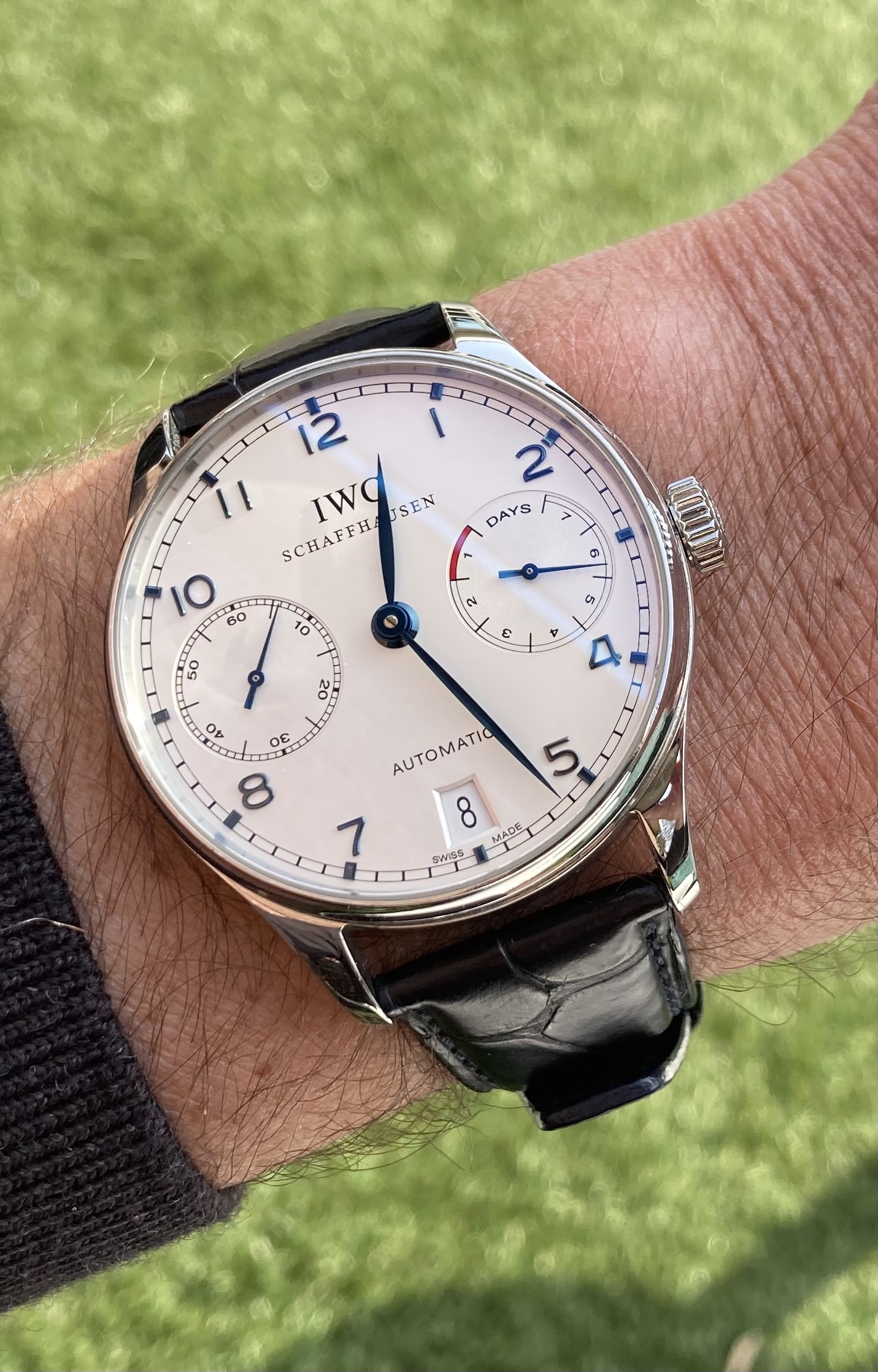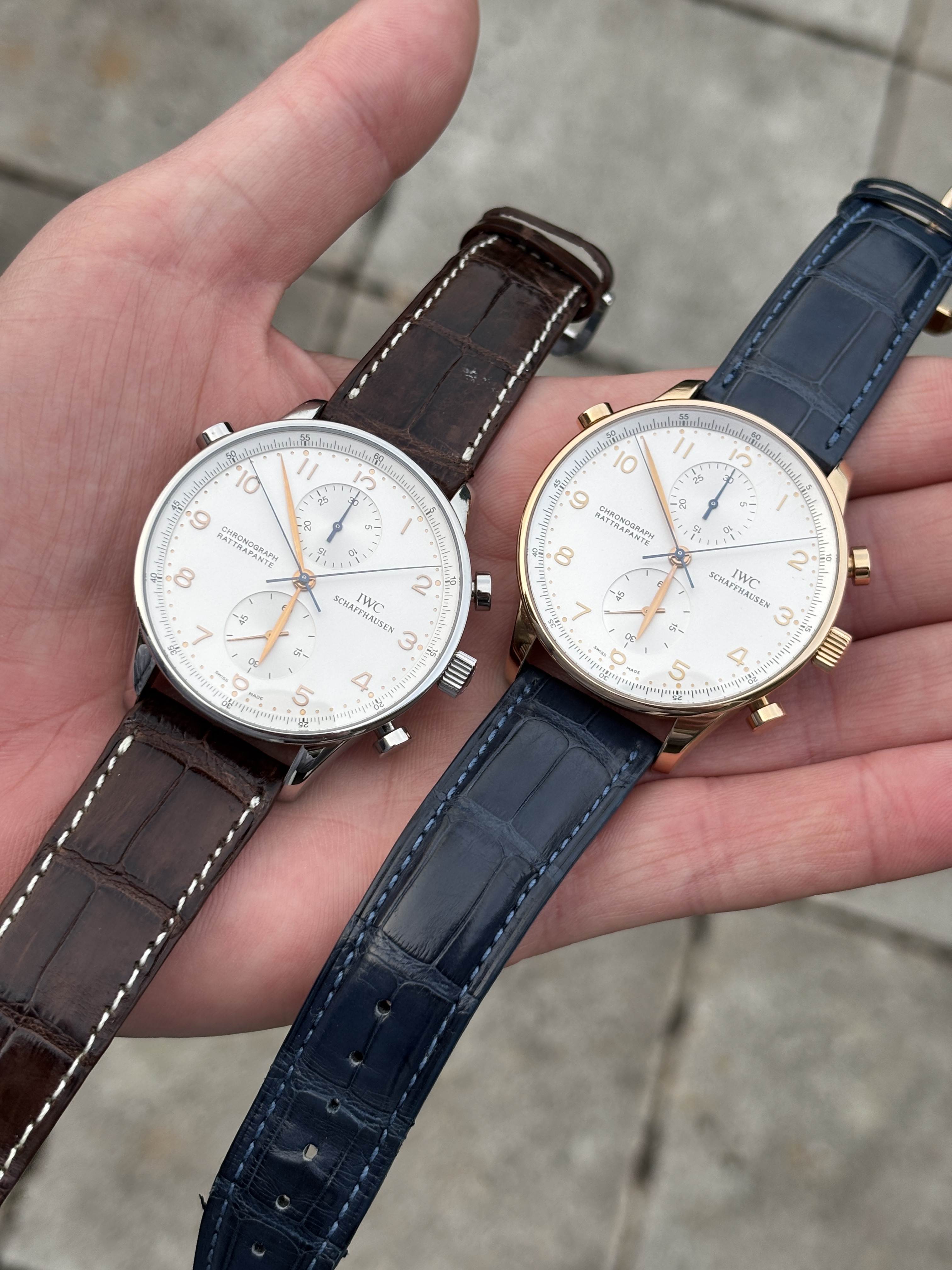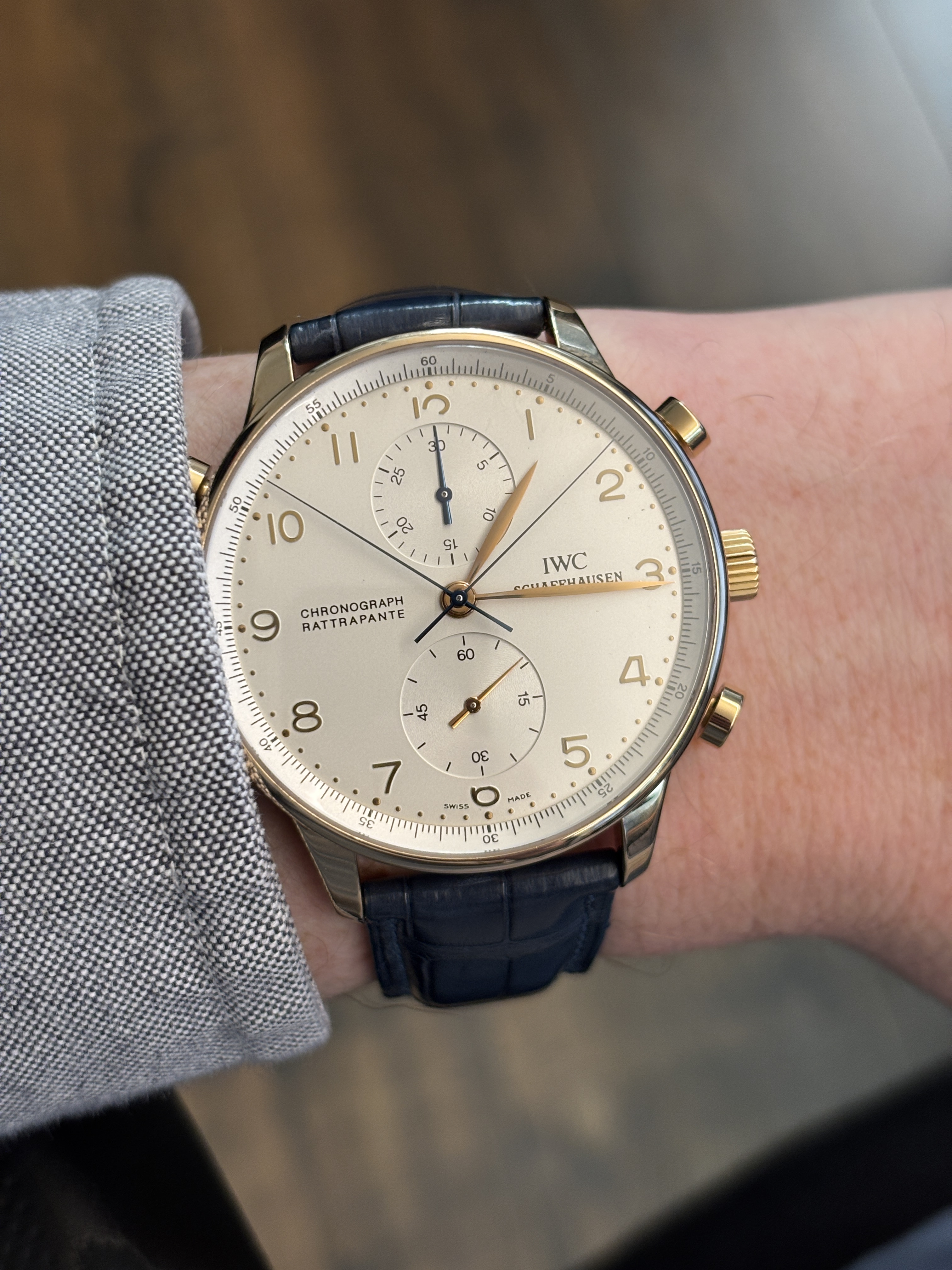 Dat vind ik geweldig aan een gouden Portugieser Chronograph: doordat het vooral wijzerplaat is die je ziet en weinig kast, komt het niet over als een “blok goud om je pols”. Niet overdadig of opzichtig.