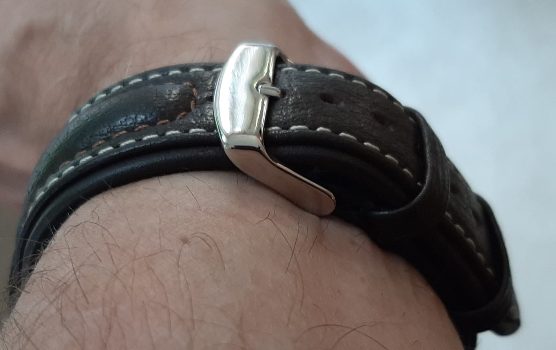 Voor de liefhebber van een stevige band, dit is de Rios1931 in buffelleer. Mooie kleur en lekker dik met 5mm aan de kast. Maar wel voor de wat grotere pols van 19cm en meer want op mijn 18,5cm zit ik al aan het een na laatste gaatje.