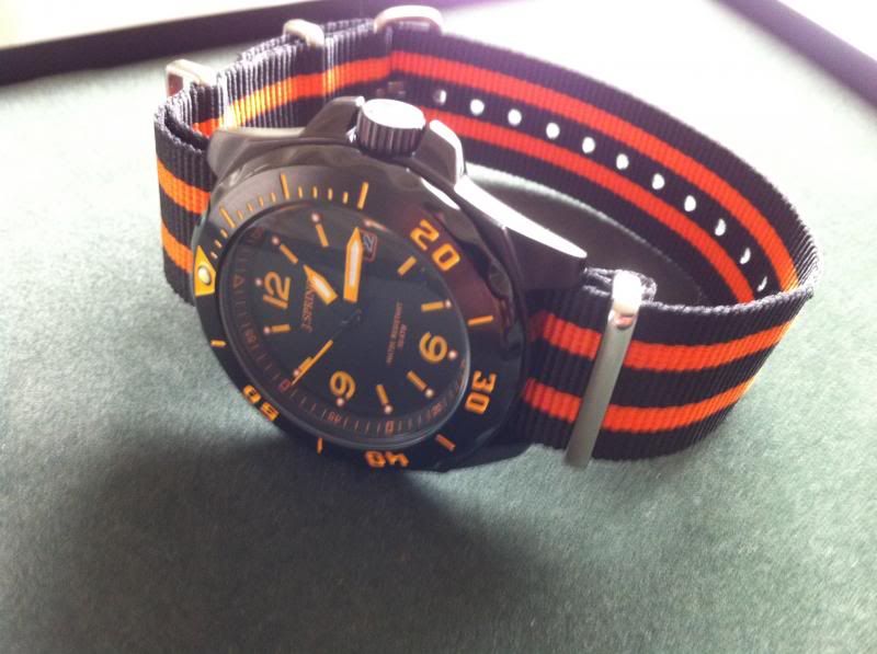 En ik vond het wel leuk om er een nato om te plaatsen, origineel is hij met ook zwart gecoate stalen band.