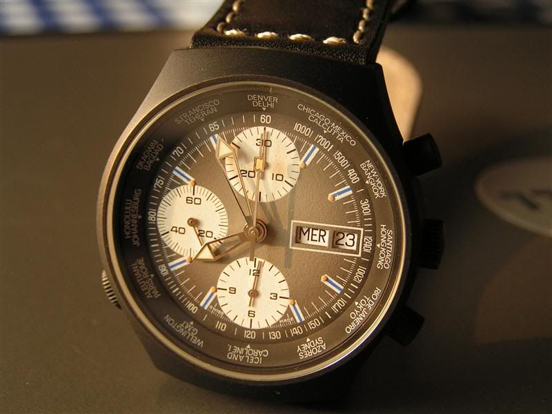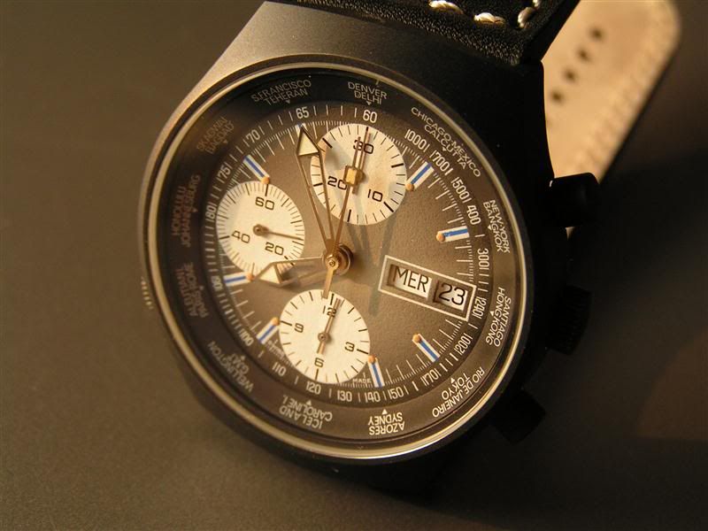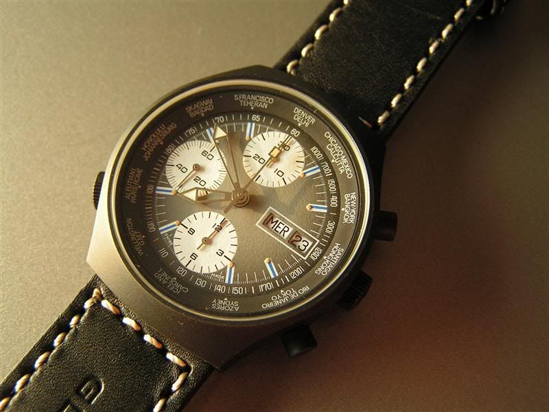 Dit is het resultaat een PVD kast met een stedenring. Binnenin tikt een Valjoux 7750 van Hamilton die volledig is gereviseerd.