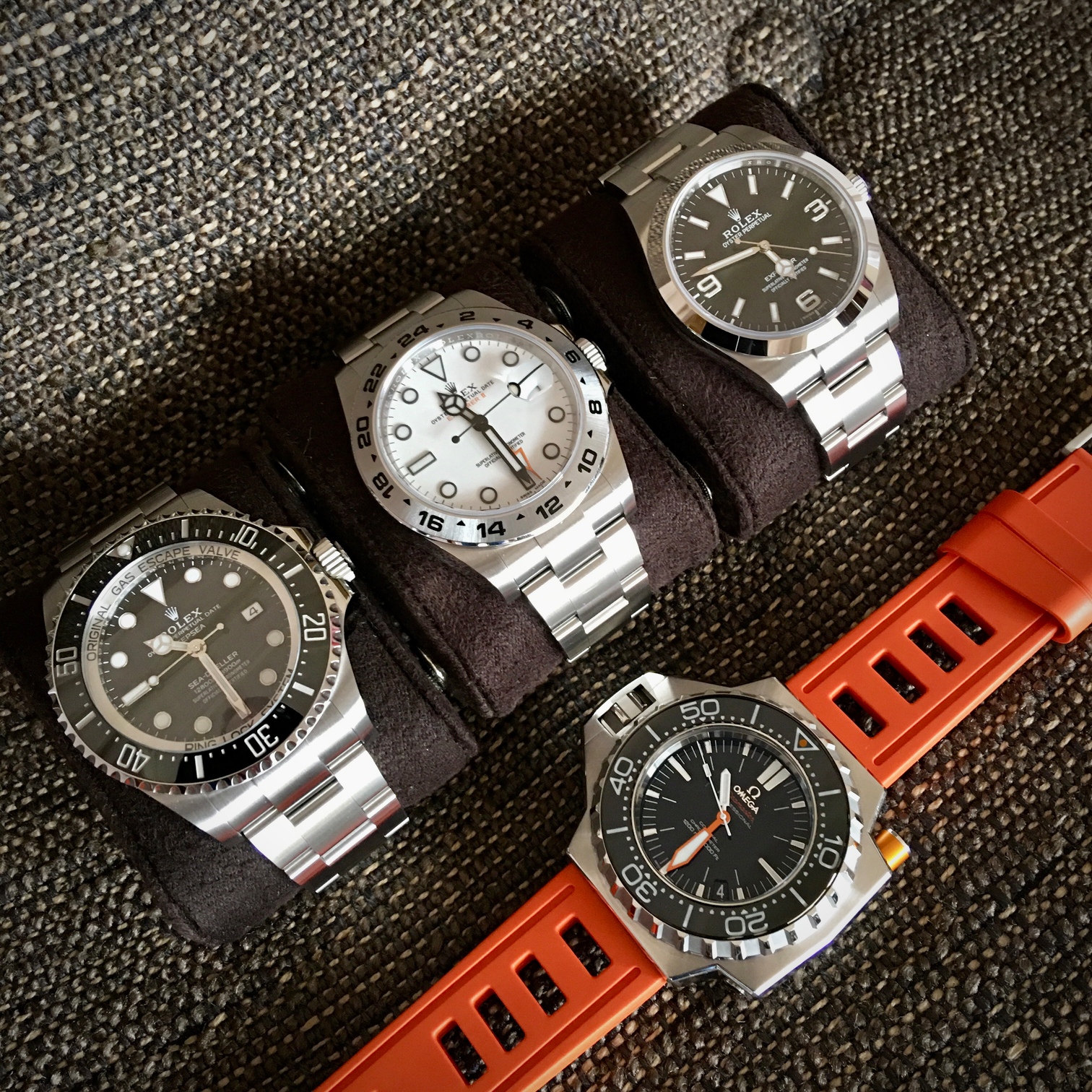 Leuke afwisseling van modern en vintage. Ik zou ze allemaal ook in mijn collectie willen (misschien een andere nomos en een andere divers65, maar verder helemaal mijn smaak)