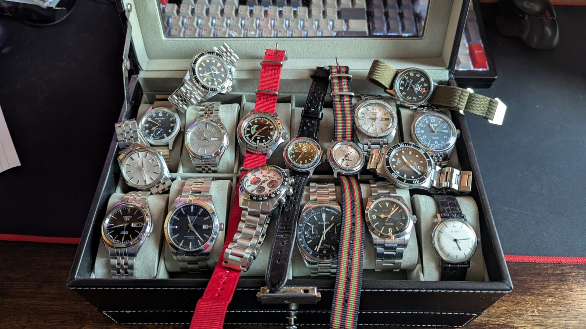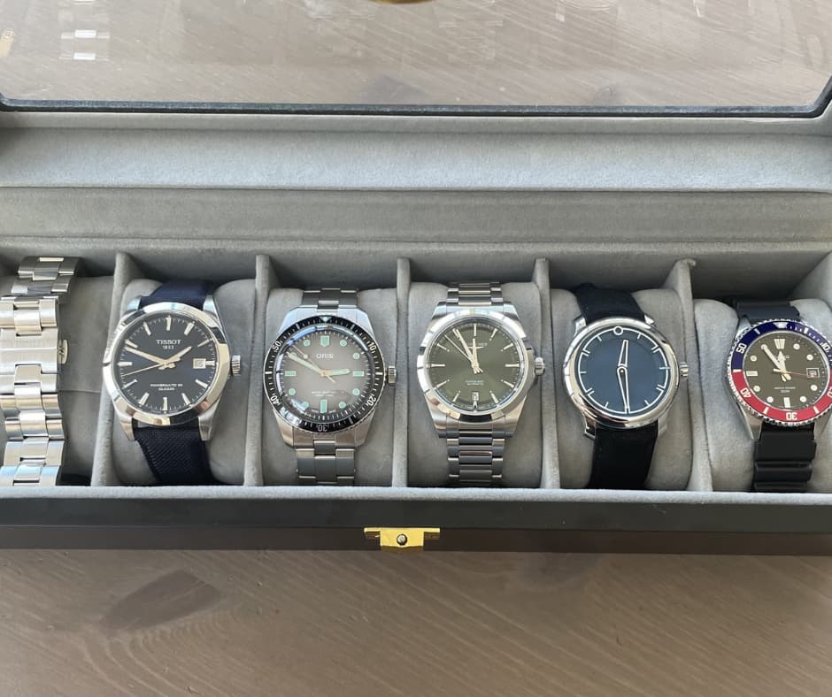 De huidige stand van zaken na de komst van de Longines. Nog 1 plekje vrij in de doos, op dit moment wordt het plekje warm gehouden door de stalen band van de Tissot. Deze zal wat later op het jaar ingenomen worden, nog meerdere kandidaten “in the running” en dankzij al jullie inspiratie verwacht ik dat de lijst alleen maar zal uitbreiden. ![]()