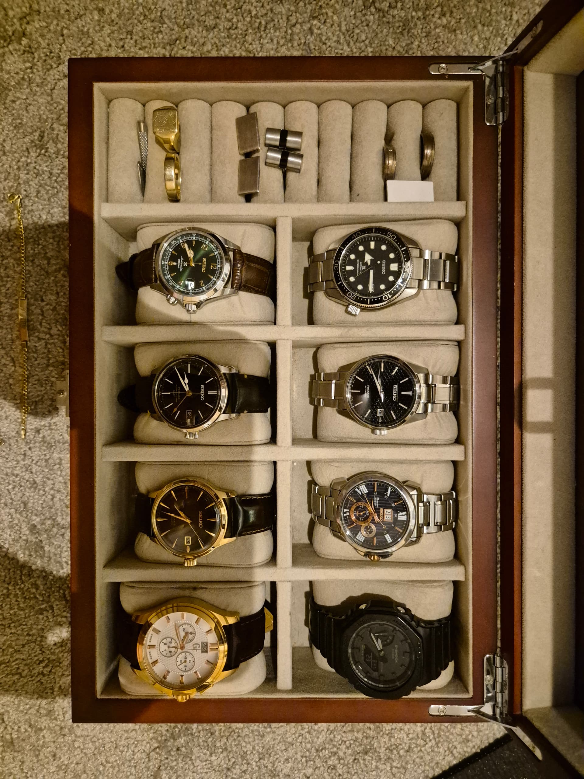 Mijn collectie, ik wil er nog wat kleur en een mooie witte dial aan toevoegen, maar ik probeer het bij 12 horloges te houden en niet door te slaan dus dan moeten er een paar weg ![]()