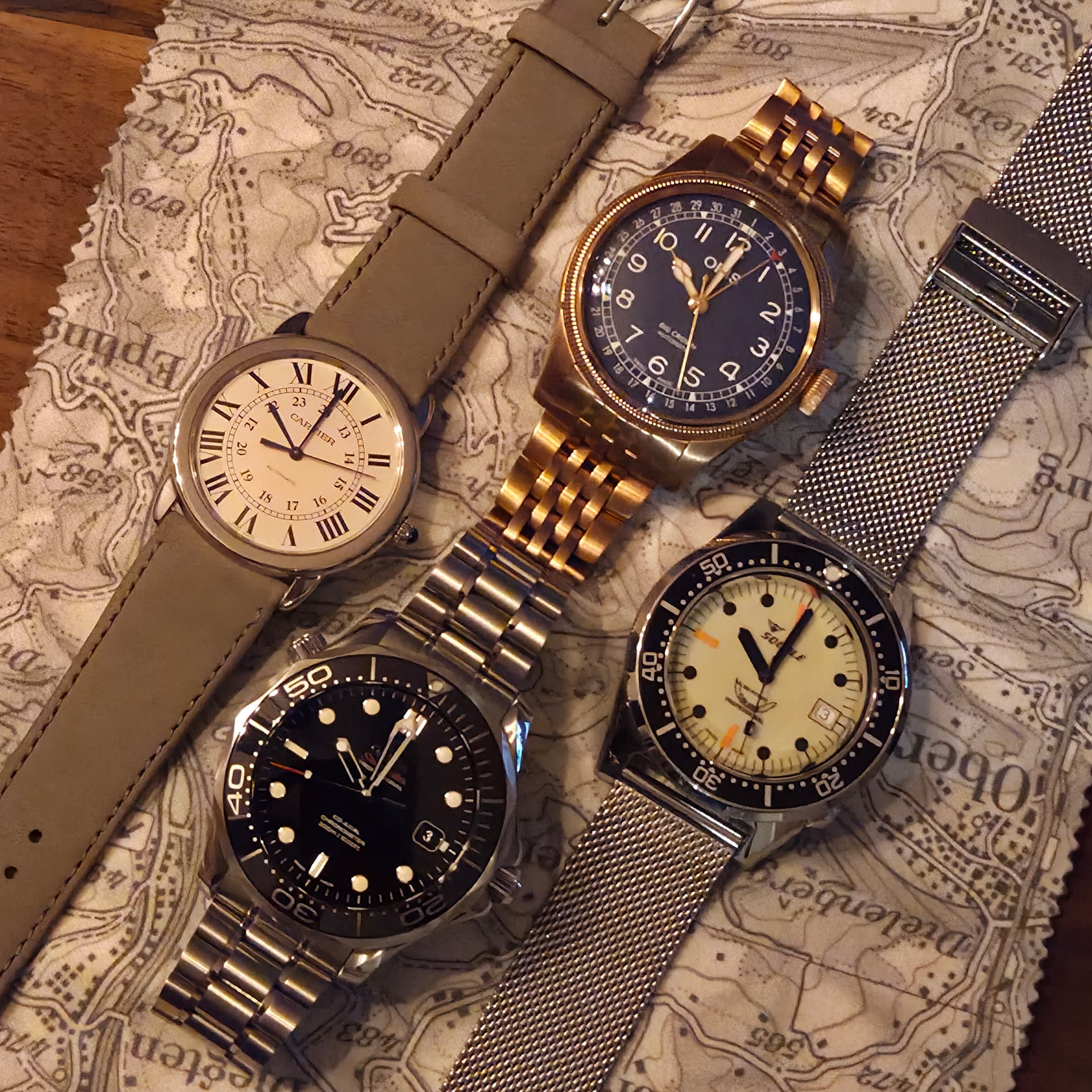 18 dagen geleden stuurde ik hier dat ik tevreden was met de Omega, Cartier, een Doxa en een Seiko mod. Op zich was dat waar, maar toch is de helft daarvan weer gewijzigd. Na inmiddels 6 NA’s dit jaar (oeps ) is dit uiteindelijk het viertal waarmee ik richting de zomer ga knallen