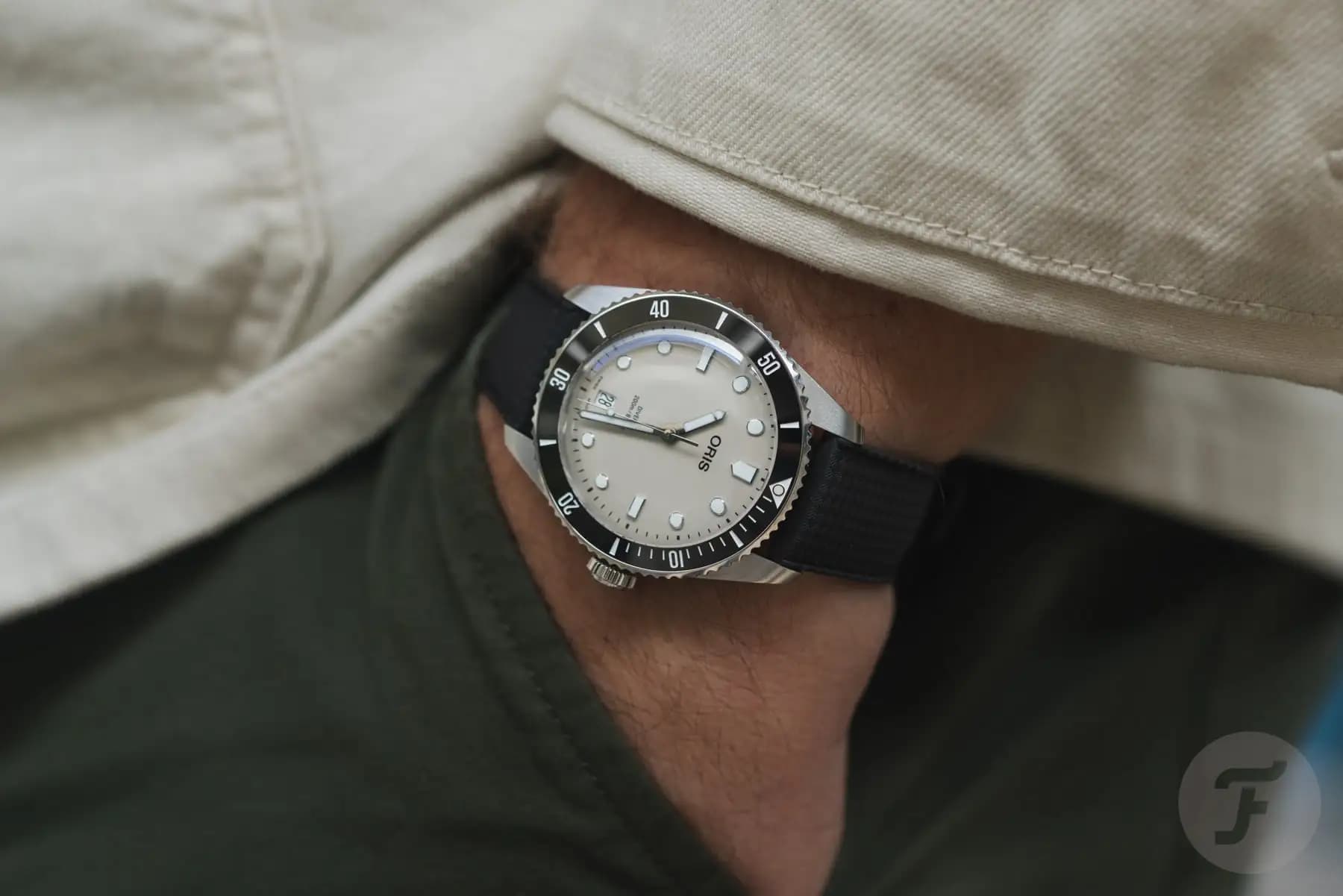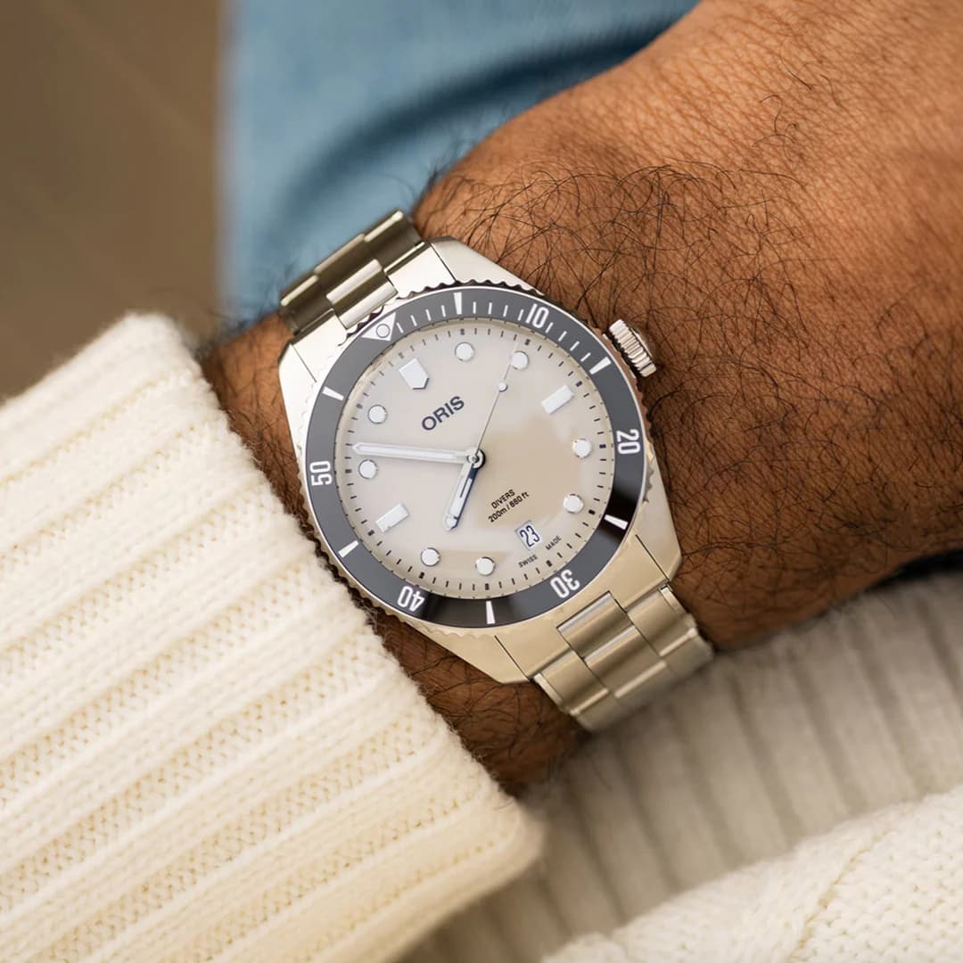 Wat dacht je van een Oris Diver date? Niet té sportief, maar ook niet te chique. Gewoon een duiker met een rustige uitstraling die nergens misstaat. De stalen band heeft gepolijste details op de zijkant die het horloge net wat meer flair geven (dit is lastig te zien op de foto’s, maar duidelijk in het echt)