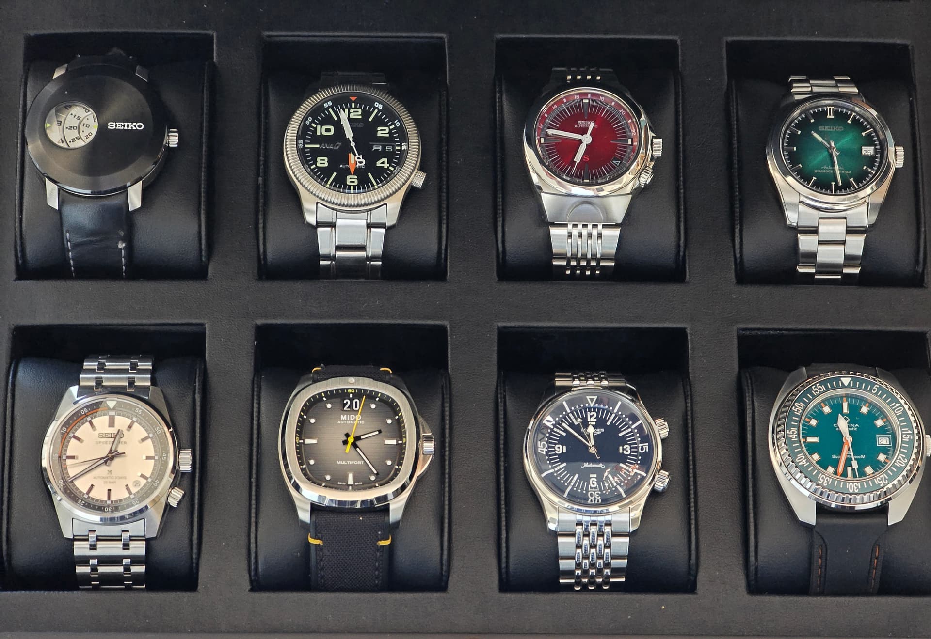 Hoewel ik ooit met mezelf afsprak te streven naar een collectie van drie tot vier horloges, is het de laatste jaren toch weer wat uit de hand gelopen… Op dit moment past de collectie in dit doosje, waarin ik ruimte heb gemaakt voor tien stuks. Het ‘gat’ linksboven is voor de Tutima die ik eerder postte (https://www.horlogeforum.nl/t/nur-deutsche-uhren/270970/527?u=diverlover en nu naar Ganderkesee wordt gestuurd (in de hoop op een betaalbare service-offerte) en het tweede gat is voor iets nieuws.