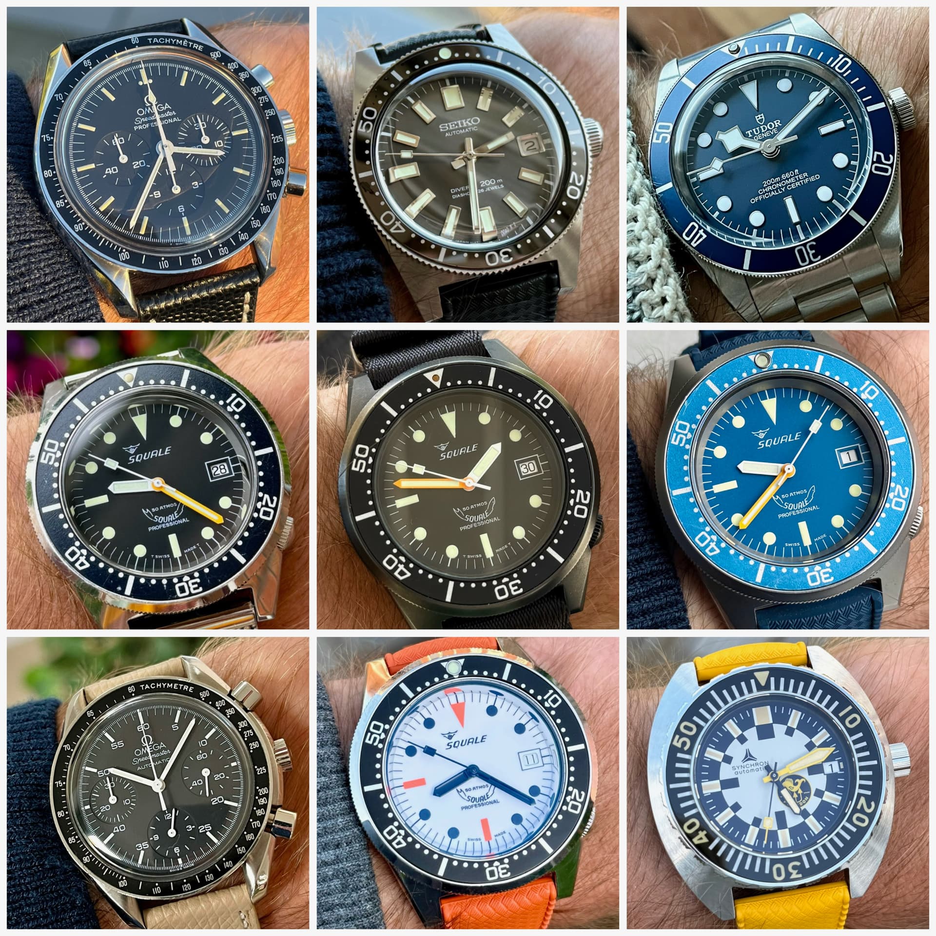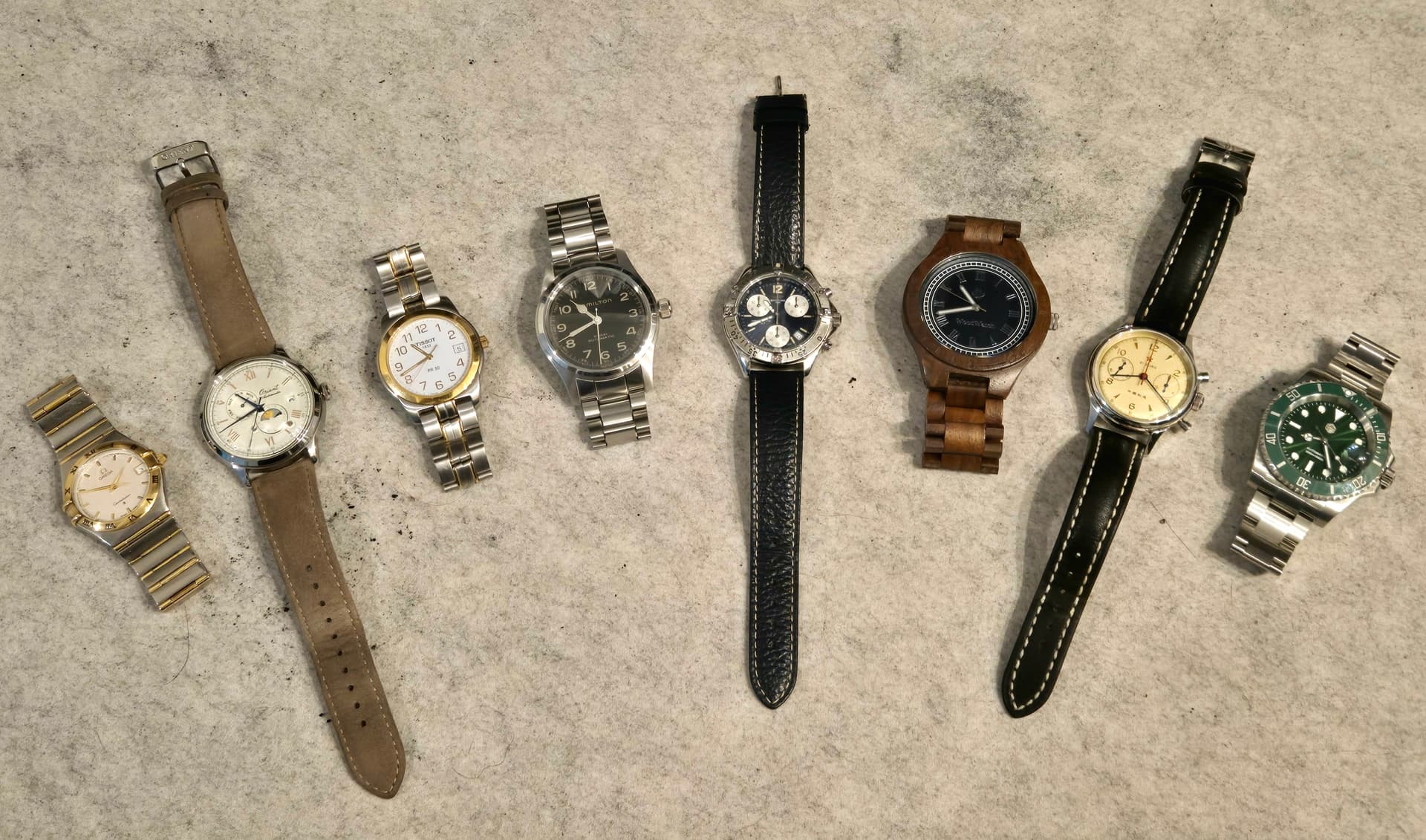 Ze allemaal eens samen gelegd op hun huidige horlogebanden. Eerlijkheid gebiedt mij te zeggen dat de Omega (van mijn vader) niet gedragen wordt wegens te klein voor mijn pols. De Tissot (ook van hem geweest) wordt ook enkel op momenten voor hem gedragen. De San Martin zal er waarschijnlijk op termijn wel uitgaan voor een echtere duiker. Alleen, welke? Er is zoveel keuzs. En misschien is er nog een plekje voor een GMT.