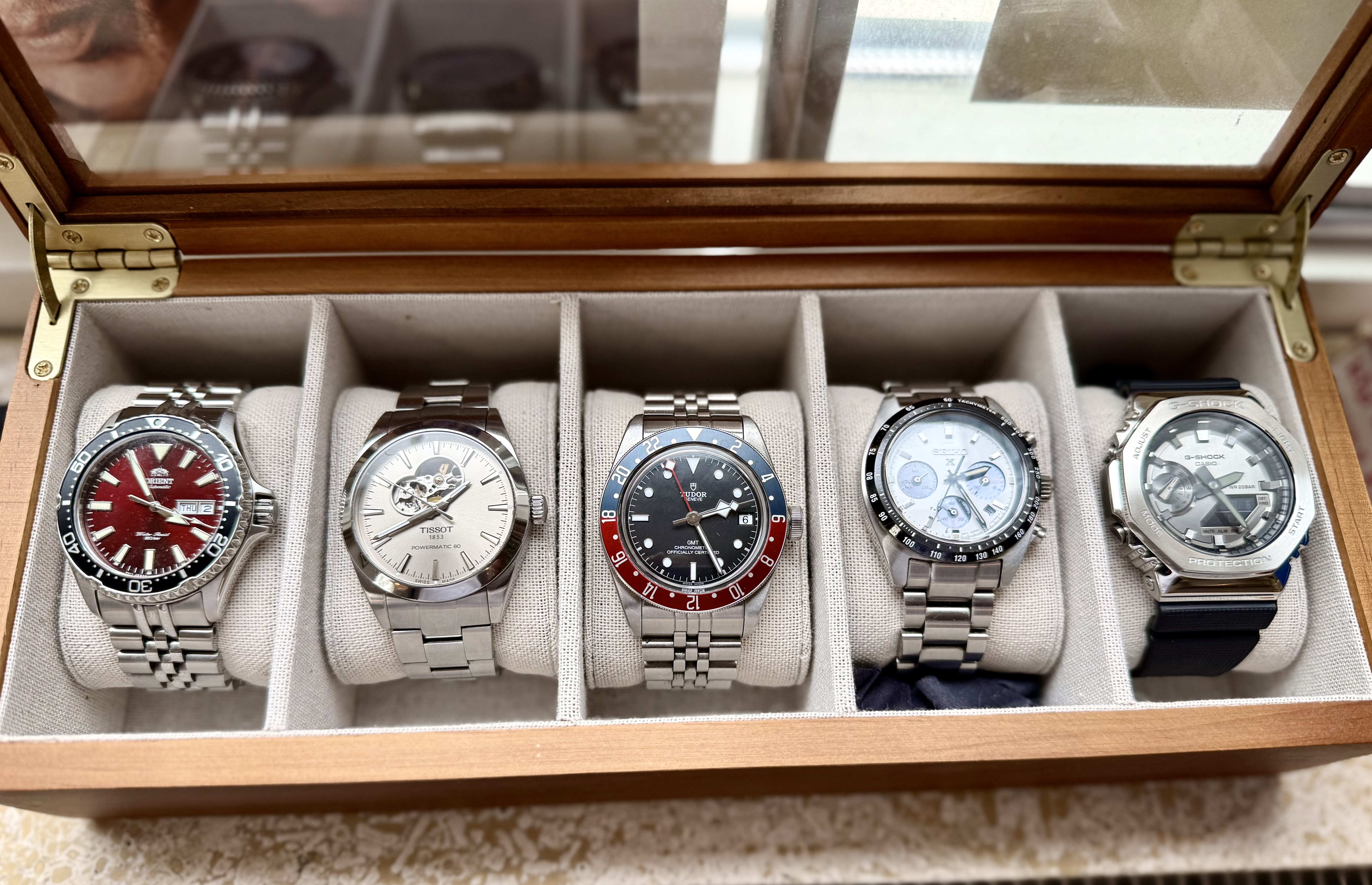 Ik ging in eerst instantie voor de zwarte. Dan had ik een wit, blauw en een zwart horloge (de zwarte is later de Panerai geworden). Toch gekozen voor deze omdat die meer bij mijn stijl past. De Panerai kan dan weer wel vanwege de bruine band. Vroeger had ik veel meer met zwart, tegenwoordig bijna niets meer.