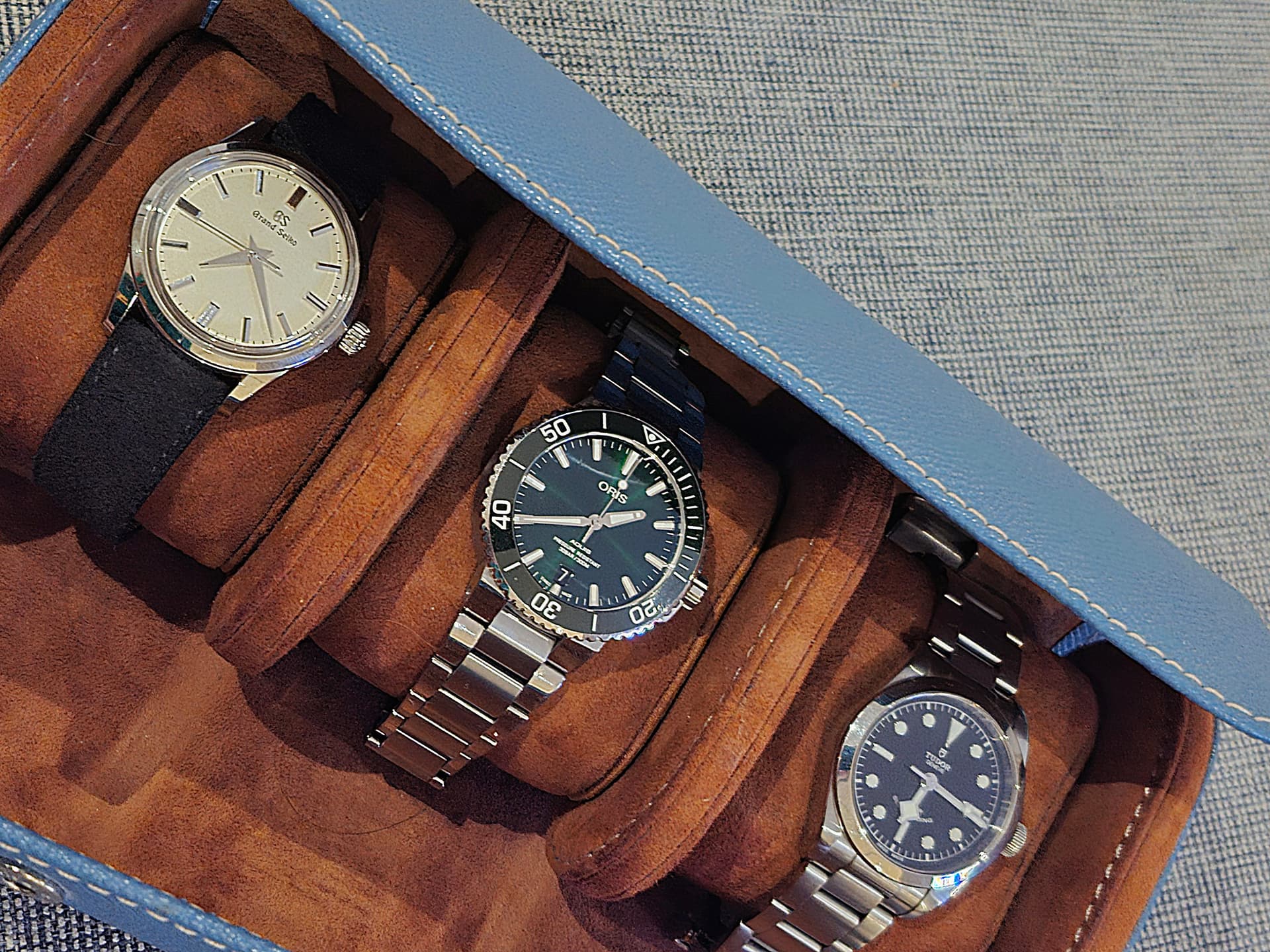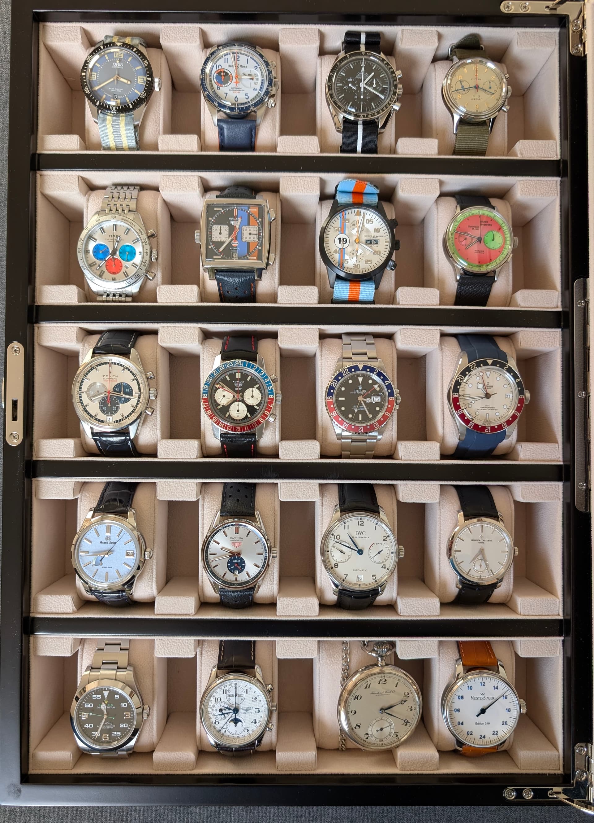 Wat is het toch onmogelijk om al je horloges in je watchroll op de foto te kieperen. Maar nou soit, het lijkt soort van gelukt.