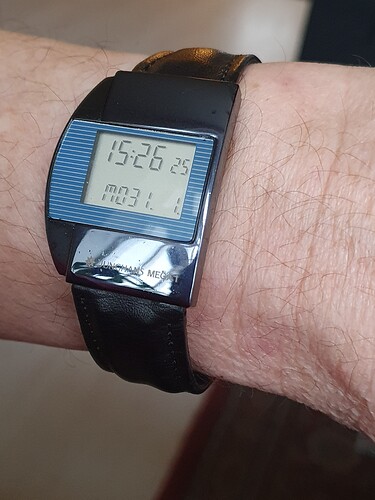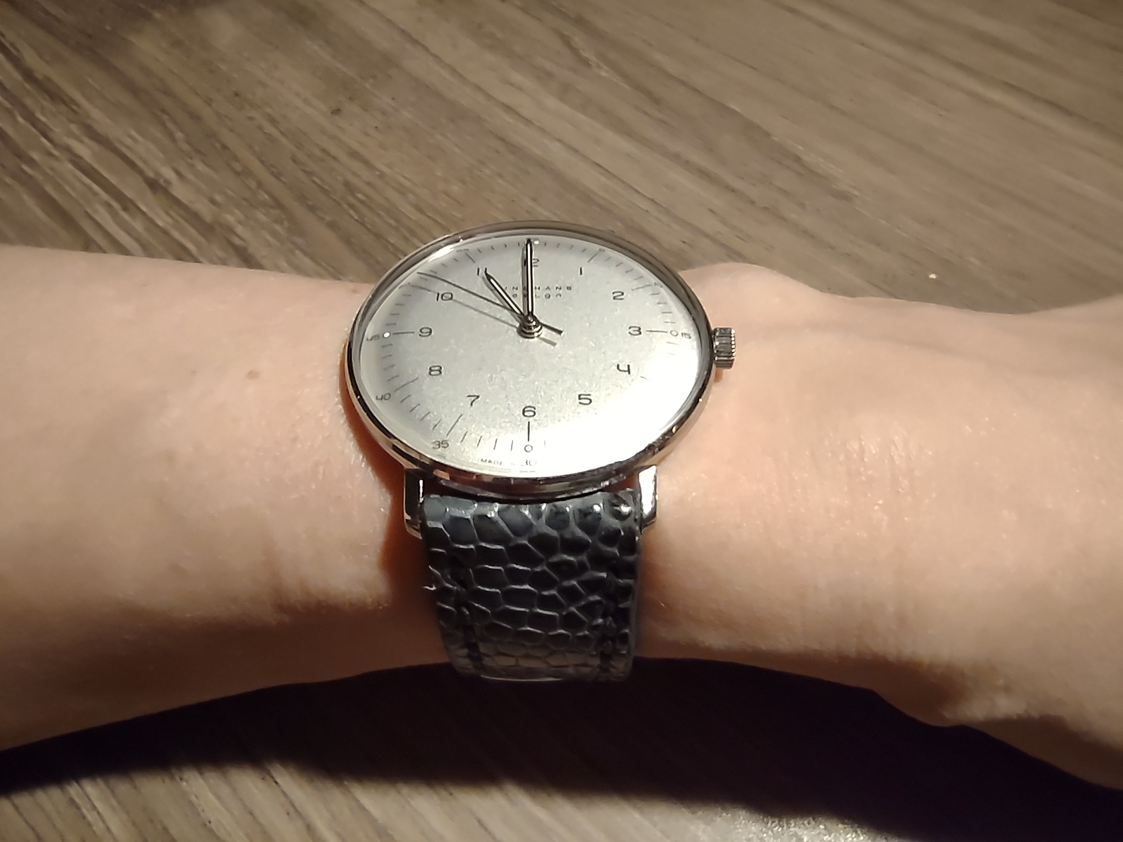 Wel voor mij, maar het is zeker geen nieuw horloge. De leeftijd is onbekend, maar het horloge is in erg goede staat. Op junghans-vintage.de staat hetzelfde model met een leren band en een andere kleur wijzerplaat, deze zou uit 1988 komen.