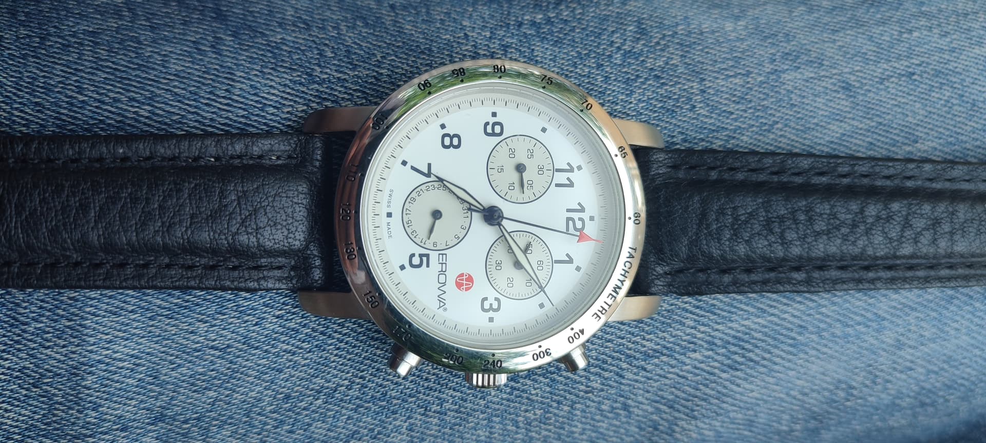 Zal eens zoeken waar Erowa in Zwitserland gevestigd was en waar ze mogelijk dit type horloge hebben laten voorzien van hun beeldmerk op de wijzerplaat van deze chrono