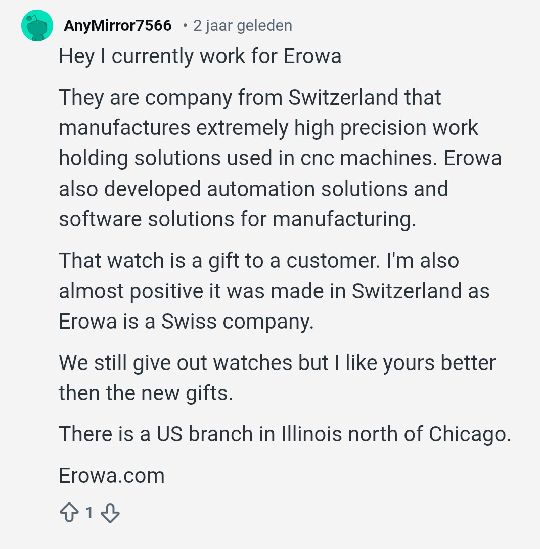 Hallo ben hier nieuw. Heb n wat ouder quartz horloge kado gekregen. De naam op de wijzerplaat is Erowa. Ik ken Erowa niet als horlogemerk en kon op t internet er ook niets van vinden. Als oud spuitgieter weet ik dat matrijs makers vonkerosie machines gebruiken van de zwitserse fabrikant Erowa.