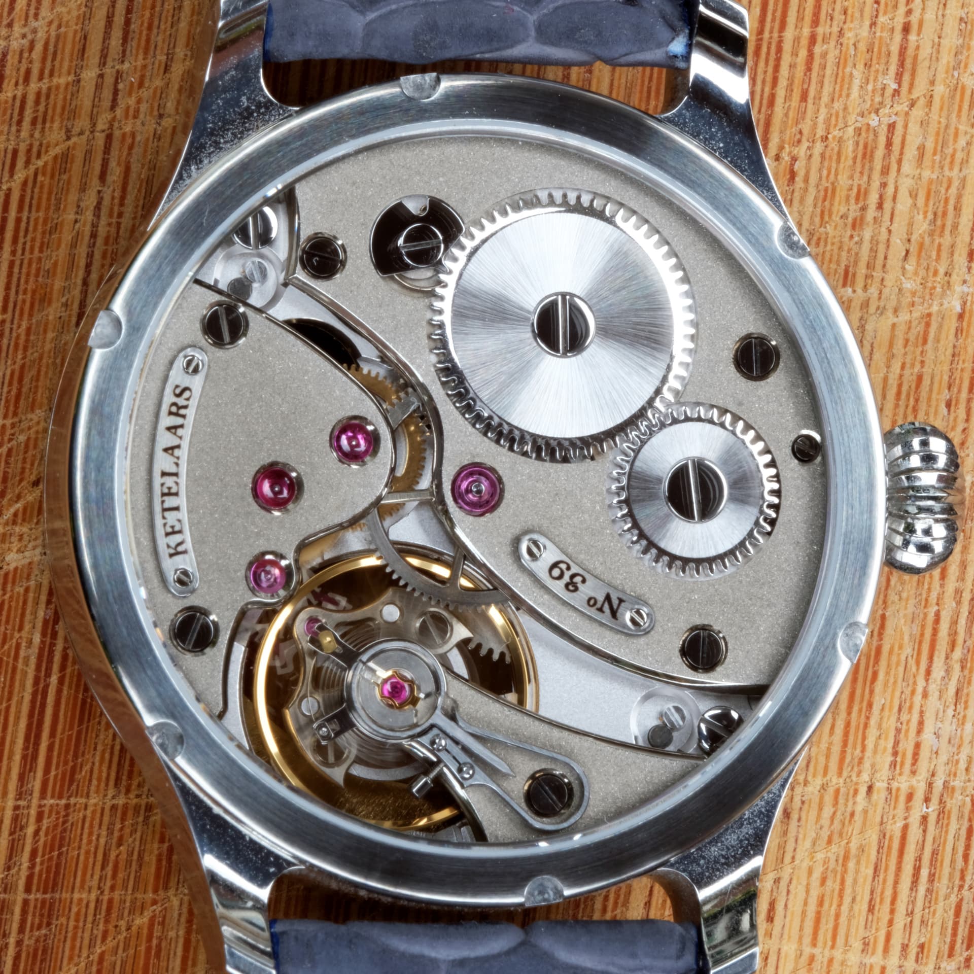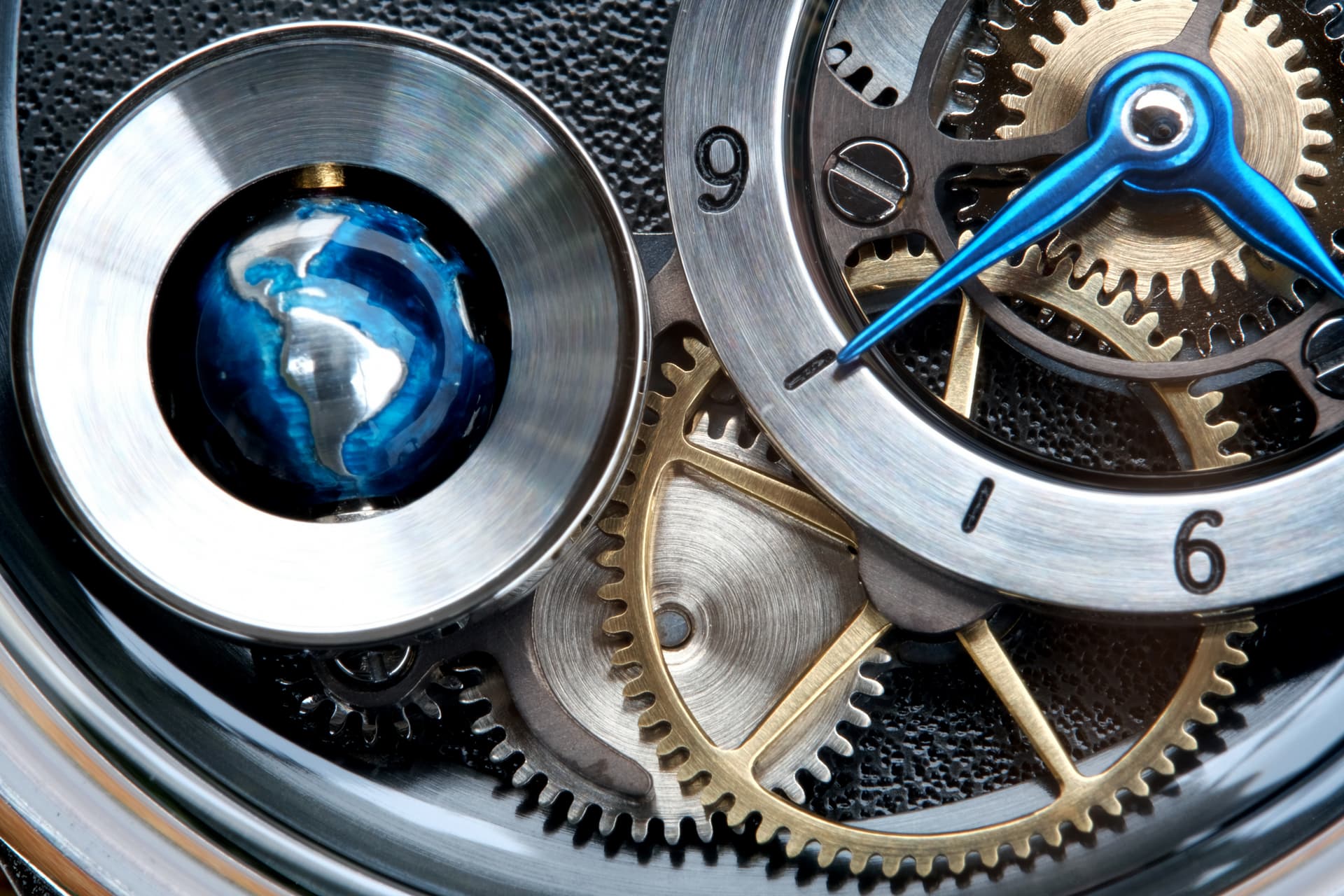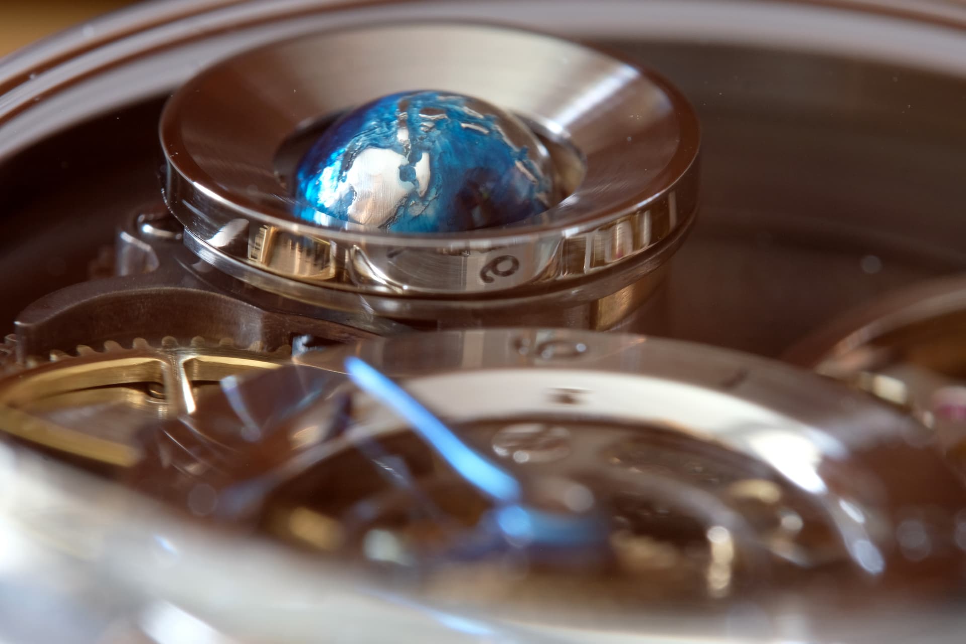 Het betreft hier de Terra in Motion van Stefan. Het welbekende model met de prachtig uitgevoerde 3D wereldbol. Deze uitvoering heeft een mooi gedecoreerd (frosted) uurwerk aan de achterkant en aan de voorkant een custom uurring en een handgehamerde (zie de laatste foto; je wilt denk ik niet weten hoe veel tijd hier in is gaan zitten) dial. Enig in zijn soort in deze uitvoering zo ver ik weet.
