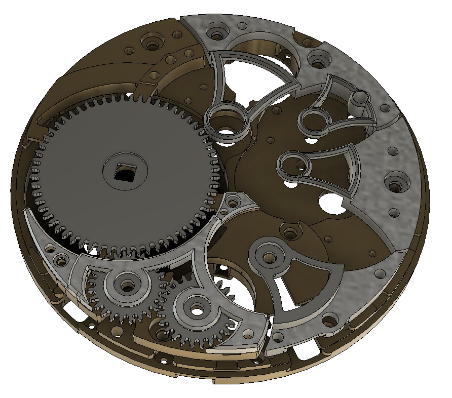 Ik denk dat daar de oplossing ligt. Eventueel het kroonrad iets kleiner maken (wel meer werk) en de 2 tussenliggende tandwielen even groot als het kroonrad maken. Alles dezelfde diameter richting het palrad net als bij de Omega 1030.