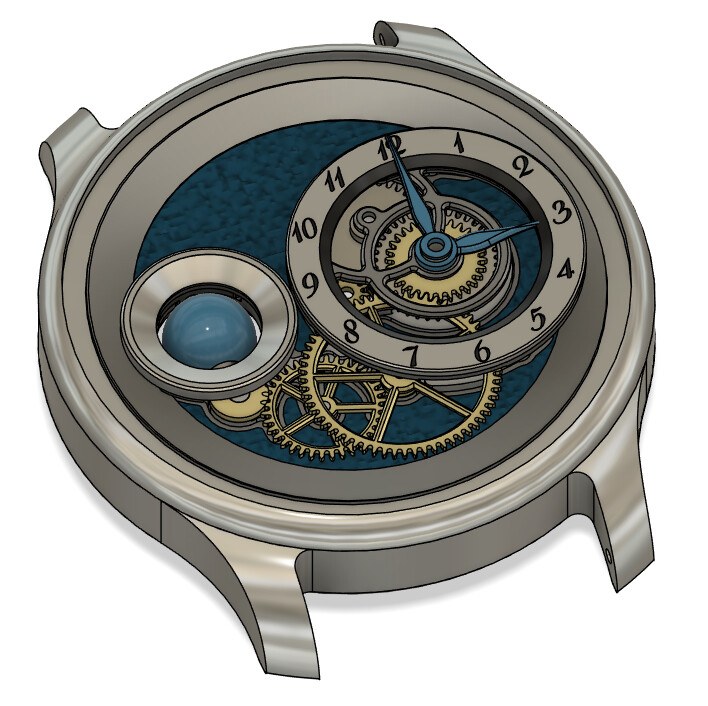 Er komt een Sellita SW215-1 uurwerk in, alleen bij dit uurwerk was er genoeg ruimte om de wereldbol volledig in het uurwerk te verzinken op de 9 uur positie.
