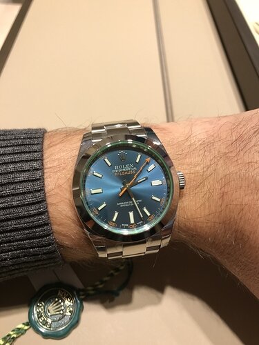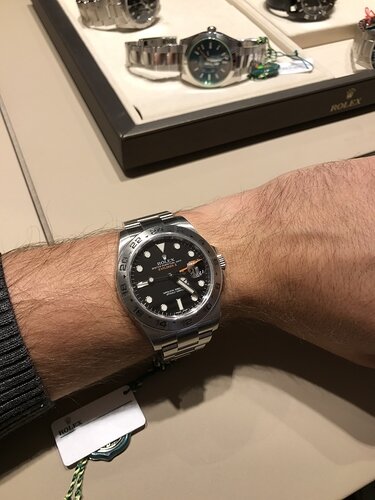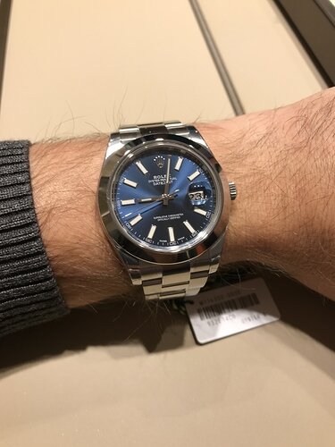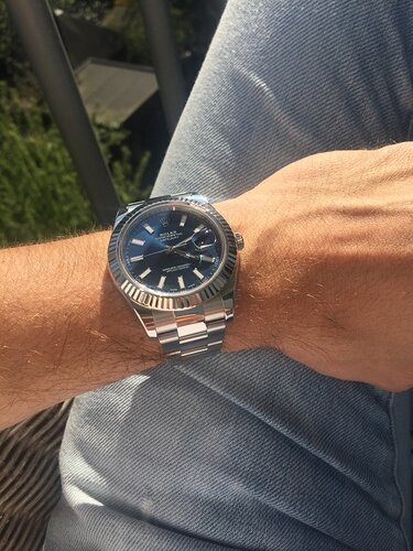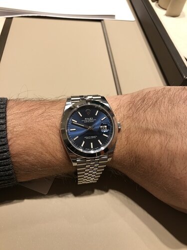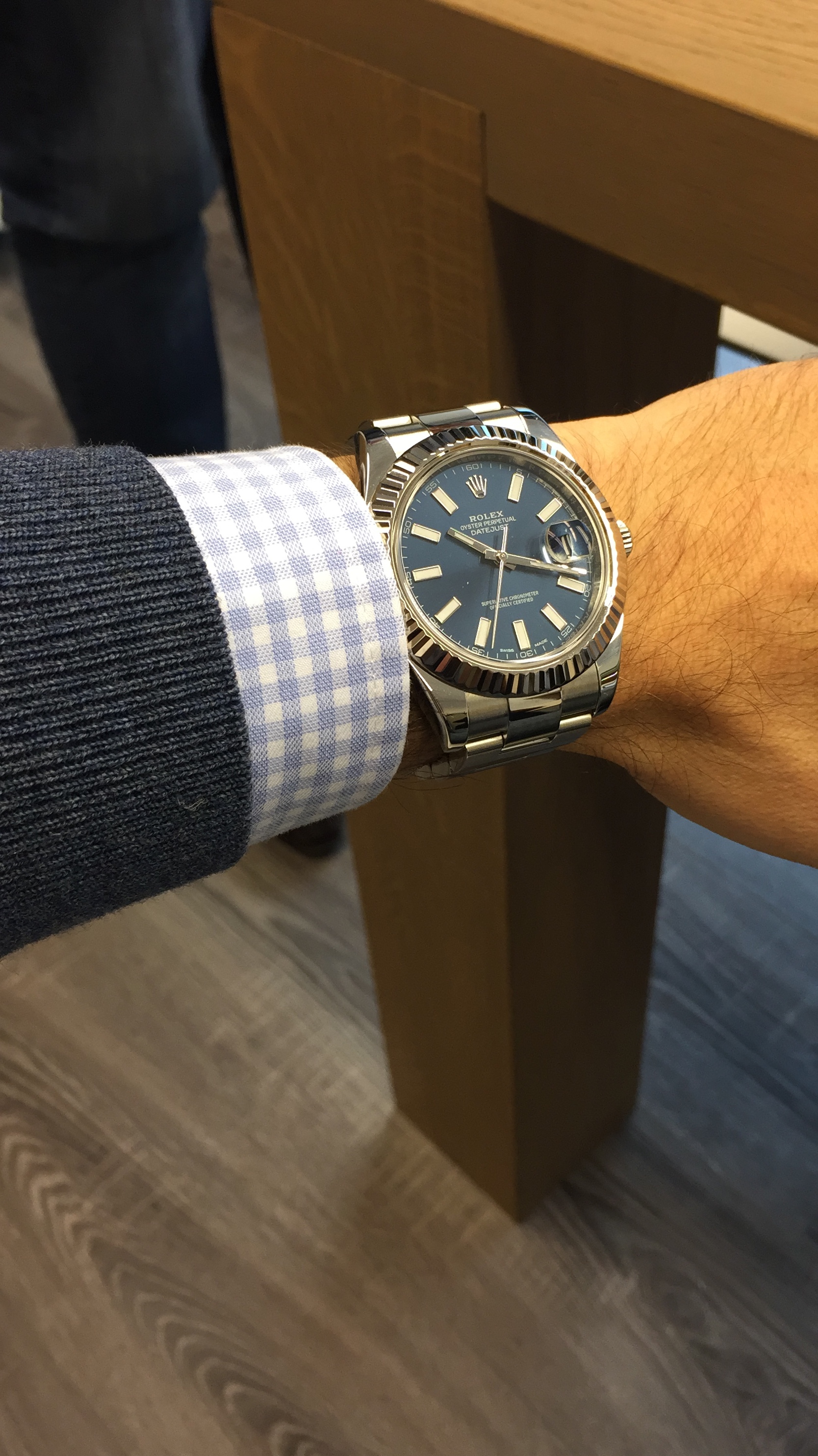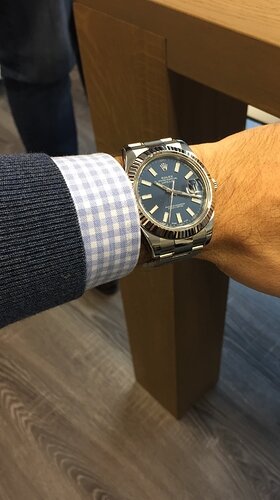 Een week geleden ben ik met mijn zwager bij Schaap en Citroen geweest om wat modellen te passen. Voor mijn werk heb ik geen pak aan, maar kan ik overdag ook geen horloge dragen. Ik draag hem dus met name in mijn vrije tijd bij een spijkerbroek. Mijn voorkeur gaat op dit moment uit naar de DJ II omdat hij wat “dikker” is dan de 41. Echter zijn de geluiden over het algemeen positiever over de DJ 41 omdat die verhoudingen beter zouden zijn. ( beter voor de restwaarde, mocht hij ooit ingeruild worden??)