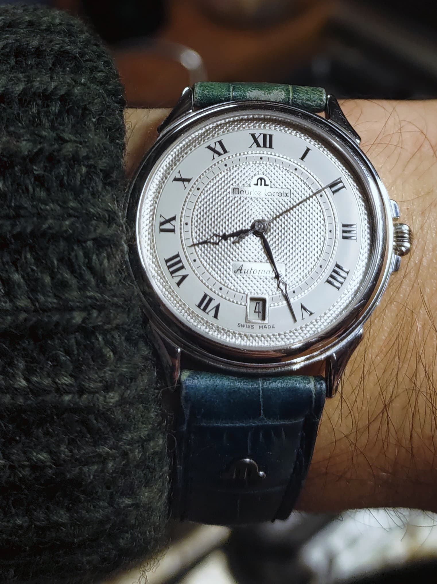 En daarom ook een witte of champagne wijzerplaat. Blauwe plaat en dan bijkleuren met leer wil soms net niet lekker. Wit/champagne lukt altijd.