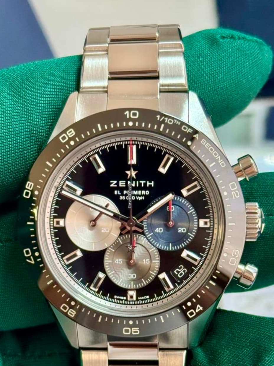 Nu heb ik dus een Zenith Cronomaster Sport Titanium op het oog. Ik vind deze toch wel heel vet. Met name dat die rust uitstraalt door de eentonige kleur. Ik vind de geborstelde bezel ook wel vet i.c.m. De sunburst dial. Nu zie ik ook veel gave stalen modelen en zelf een rose two tone knaller.