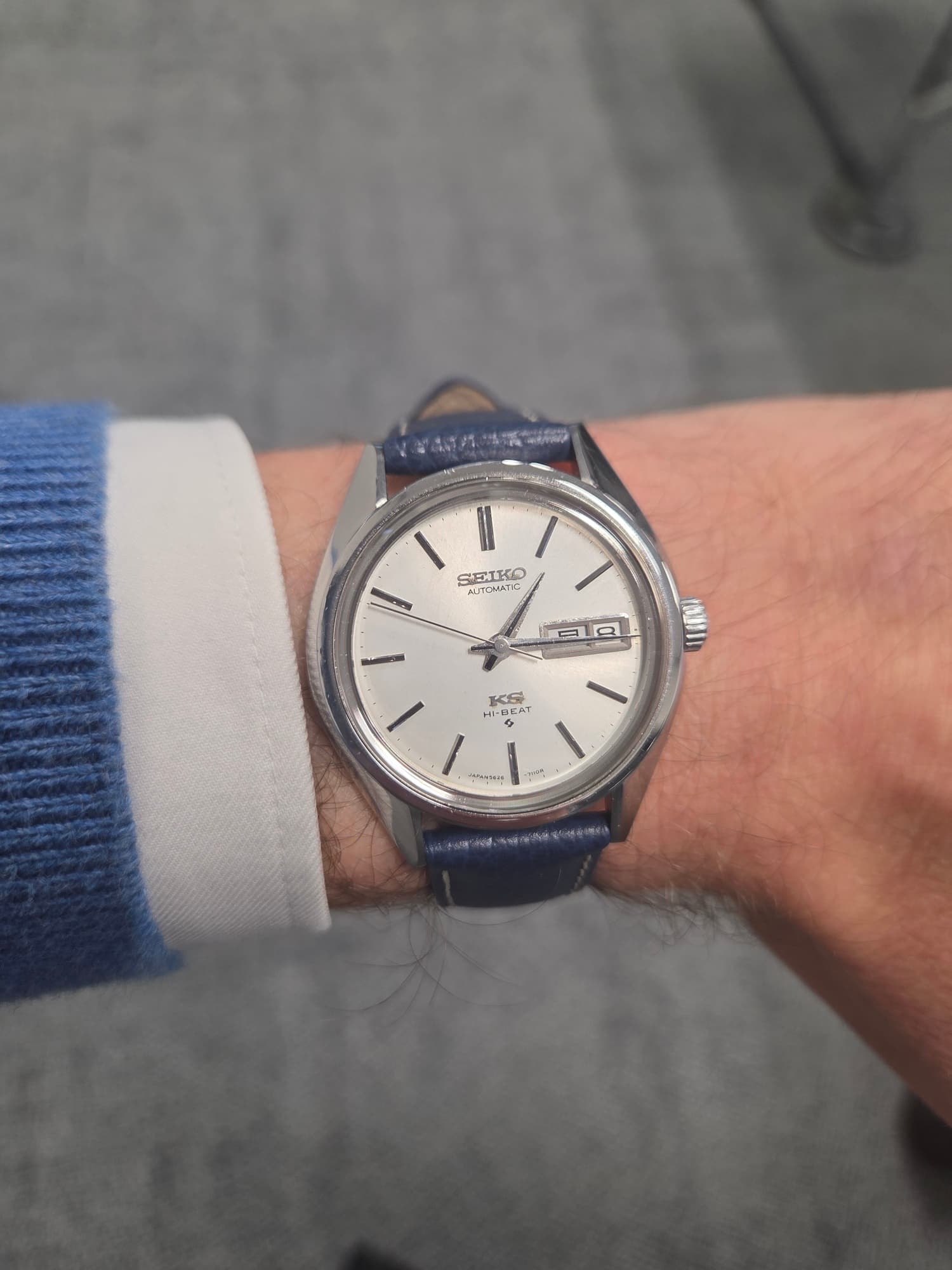 Hier mijn eerste post op het forum. Bijgevoegd een foto van mijn nieuwste aanwinst. Een KS 5626-7110 met gouden medaille op de achterkant. Loopt als een zonnetje in 3 dagen slechts 5s verloren. De dial heeft wat patina, maar dat zie je amper zonder vergrootglas. En na 54 jaar mag dat ook wel toch?