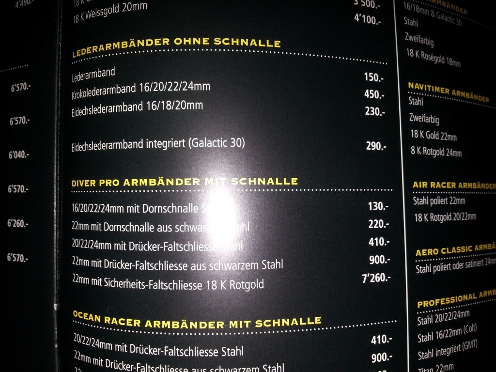 Kalfsleer kost nog steeds rond de €130-€150, laatst nog bij S&C gecontroleerd. Croco is inderdaad rond de €350-€400, maar de vouwsluiting is serieus duur. De stalenbanden verschillen per horloge, de 5 schakel (‘handgepolijste’) banden kosten €1000+, het staal voor de duikers (pro2) rond de €450.