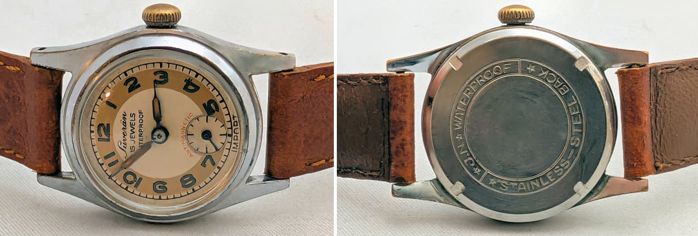 Edit: als bijzonderheid kan ik nog vermelden dat er onderaan de wijzerplaat, in plaats van het gebruikelijke ‘SWISS’ de vermelding ‘IMPORT’ staat. Op de bruggen staat geen enkele vermelding, dus misschien is het helemaal geen Zwitsers uurwerk, hoewel de bouw en architectuur wel ‘signed allover’ Zwitsers lijkt.