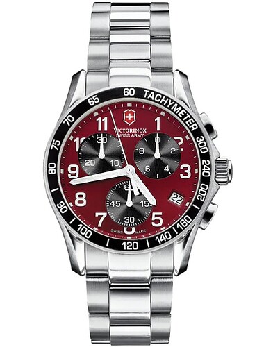 Dit is de Victorinox, in mijn herinnering was ie feller rood. Misschien is de foto wat weinig flatteus gemaakt. Als je hem mooi vindt, dan evt verder zoeken op Victorinox 241148. Ze hebben ook andere gekleurde chrono’s gemaakt, deze stond mij nog bij. Niet meer nieuw te koop, of je moet ergens NOS op de kop kunnen tikken.