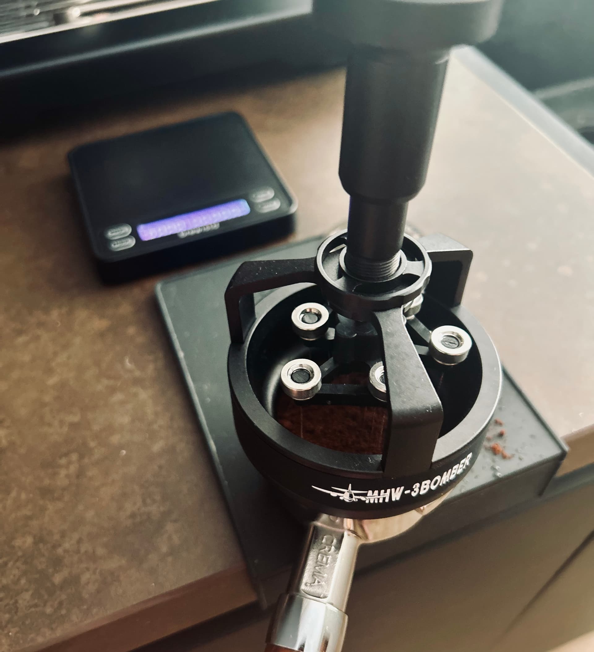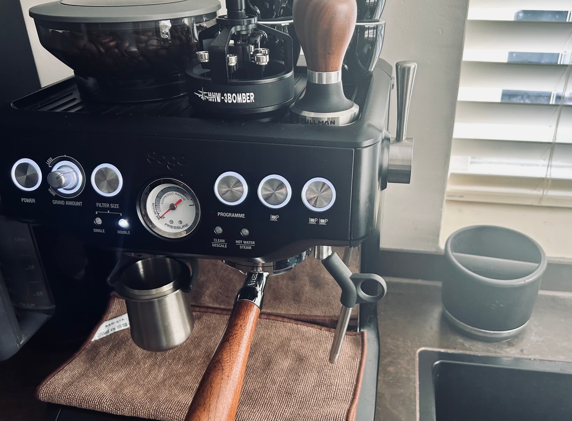 Simpele Sage Barista Express - black truffle, wel met allemaal mods en tweaks. Verder een Pullman walnotenhout tamper. MHW-3BOMBER Cyclone WDT tool (Nieuw bevalt ontzettend goed). MHW Puck screen. IMS basket & Filter op de Sage. Crema walnoot bottemless porta. En een weegschaal brewista scale III.