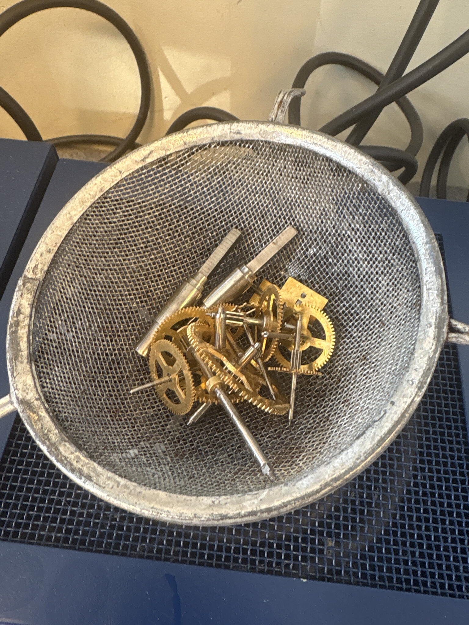 Veertrommels geopend en as verwijderd. Alles goed gemarkeerd omdat de veer van het gangwerk anders is dan die van het slagwerk. ( gangwerk is de klok, slagwerk is het geluid )