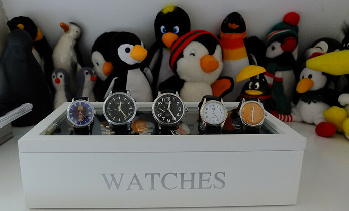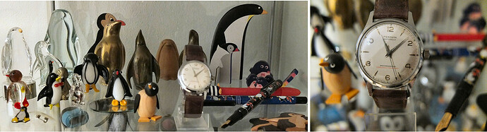 Naast deze horologische avonturen ben ik een sowieso een onverbeterlijke verzamelaar. Als er dus af en toe nog wat meer horloges in de collectie terecht komen deert mij dat niet. Er kan altijd nog wat bij en ik vind ze (bijna) allemaal leuk. Wat ik niet leuk vind en nog wel bruikbaar, draagbaar of geschikt acht voor onderdelen, geef ik af en toe weg. Als het een enkele keer nog wat waarde heeft en ik kan er afstand van doen verkoop ik soms wel eens iets. Dat verzamelen geldt overigens niet alleen voor horloges, ik heb ook een zwak voor pinguïn figuurtjes en vooral voor oude vulpennen.