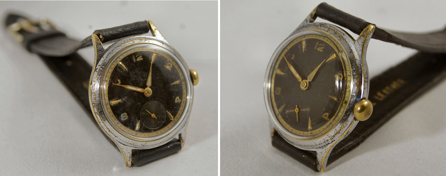 Tenslotte heb ik het ding weer in elkaar gezet en van een standaard zwart leren bandje voorzien. Het is toch leuk om te zien hoe dan zo’n oud afgeleefd horloge zijn charme nog steeds heeft en dat de draagsporen van een intensief leven naar mijn gevoel ook bijdragen aan dat karakter. Zeker als je in aanmerking neemt dat na al dit gesol met het ouwe ding door mij en anderen het nog steeds loopt en inmiddels dagen later ook nog aardig op tijd. Het afregelen moet nog gebeuren, dus het kan misschien zelfs nog beter. Wat het uiterlijk betreft: Ik begrijp dat veel liefhebbers en verzamelaars eigenlijk alleen horloges in hun collectie willen hebben die nieuw of minstens helemaal mint en gaaf en 100% in orde zijn. Dat is vaak ook mooi, maar ik word zelf toch wel enthousiast als zo’n ding met de nodige leeftijd een hele geschiedenis achter zich heeft en dat je dat dan ook kan zien, ook al zal je nooit weten wat er mee is gebeurd. Was ie van een land- of fabrieksarbeider? Een mijnwerker? Een oorlogsheld, een oorlogsslachtoffer? Of gewoon van een ambtenaar die regelmatig van zijn fiets is gevallen? We zullen het nooit meer weten, maar het is fascinerend om er over te fantaseren. Van sommige familie stukjes weet je het, maar de verborgen geschiedenis van die oude rommelmarkt horloges draagt ook een zekere magie bij zich. En die respecteer ik door deze dingen in ere en als het kan ook werkend te houden.