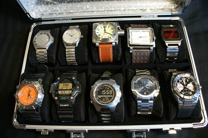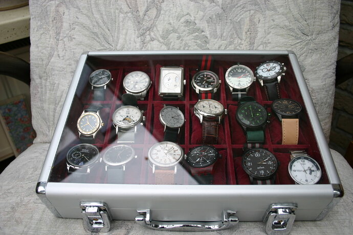 Ik heb 2 alu koffertjes met doorzichtige deksel, waar er 18 in kunnen. Vooral de wat dikkere horloges met stalen banden, zitten klem tegen het “glas”. Ik heb, als ik ze aan het handvat draag, geen rammelende of verschuivende horloges.