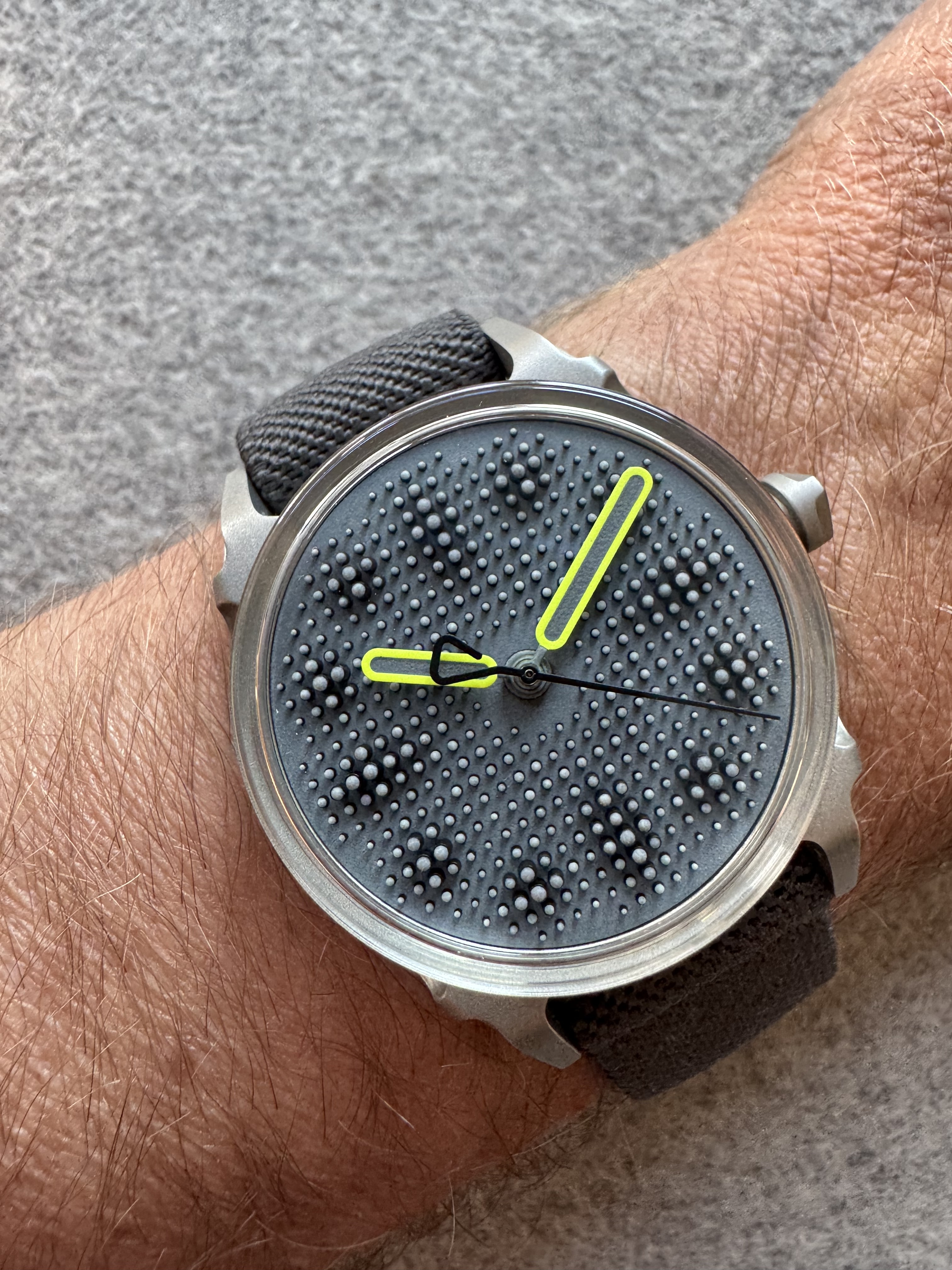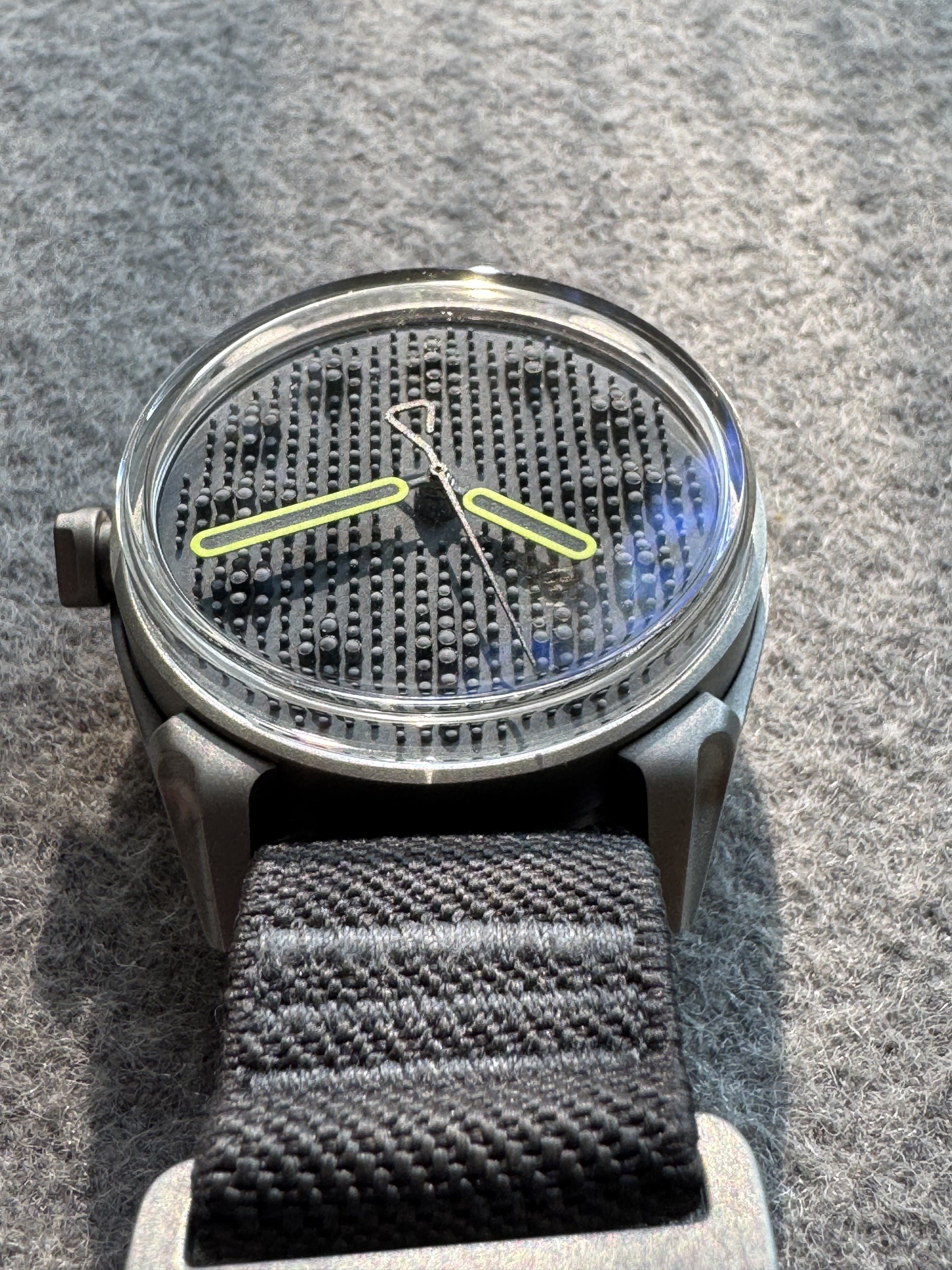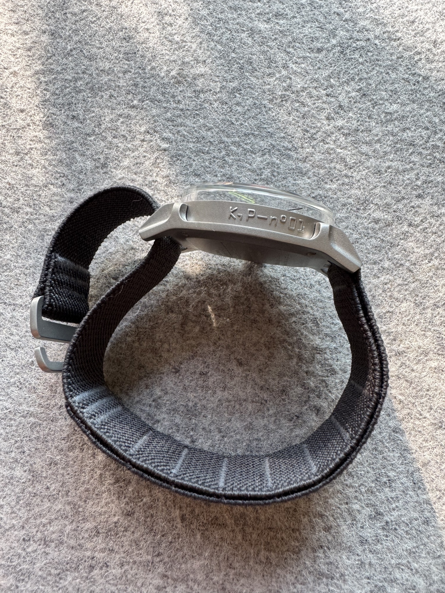 De E2 was razendsnel uitverkocht. Het horloge is een klein jaar geleden geleverd (maart 2025) en mag nu door naar een nieuwe eigenaar die de brute industriële afwerking en de unieke textuur van de wijzerplaat weet te waarderen. Helaas moet ik mijn verzameling wat terugbrengen. Daarom liever geen inruil.