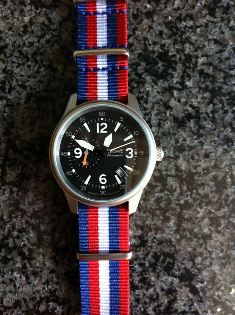 Ik had nog een witte Goer liggen met blauwe wijzers. (mijn 1e eBay aankoop ooit, $ 10,- incl shipping, maar dat zie je er ook wel aan af:D) Ik had ook nog een rood leren bandje liggen, en die heb ik er op gezet: