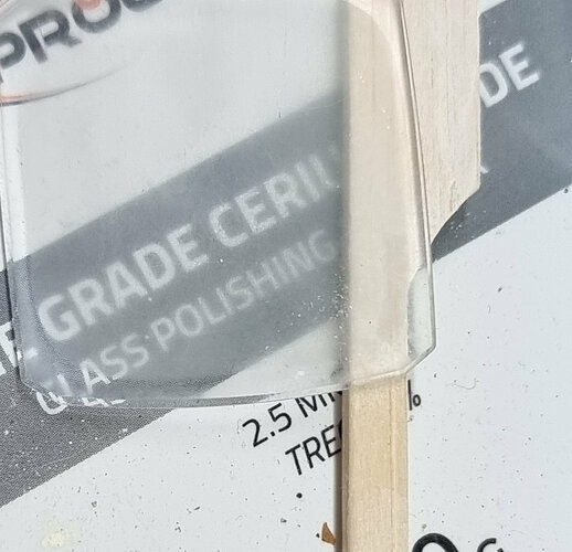 Nadat je op grit 4000/5000 zit met je diamond plate is het glaasje nog heel licht âmelkachtigâ. Er is een verschil tussen met SiC schuurpapier schuren (nog krasserig) en diamond plate (egaal). Probeer het maar eens, die diamond plates kosten je de kop niet (2-4 euro). Om het laatste restje helder te krijgen gebruik ik cerium oxide. Inderdaad machinaal. Bij een enkel stuk een dremel met kleine vilt schif (omloopsnelheid laag houden ivm warmteontwikkeling) en bij grotere aantallen een mal en een Fein oscilatieschuurmachine met diamant en viltschijven. Het glas zit met nano tape vast in de mal, de oscilatie machine valt loodrecht op het glas en druk met zân eigen gewicht op het glas.