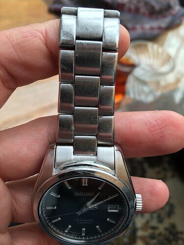 Zo’n 5 jaar geleden gaf ik mijn vader deze sarb033 cadeau. Mijn vader is een old school one watch guy en doet hem nooit af. Hij doet zwaar werk in een emaille fabriek. Dit is hoe het horloge er nu uitziet.