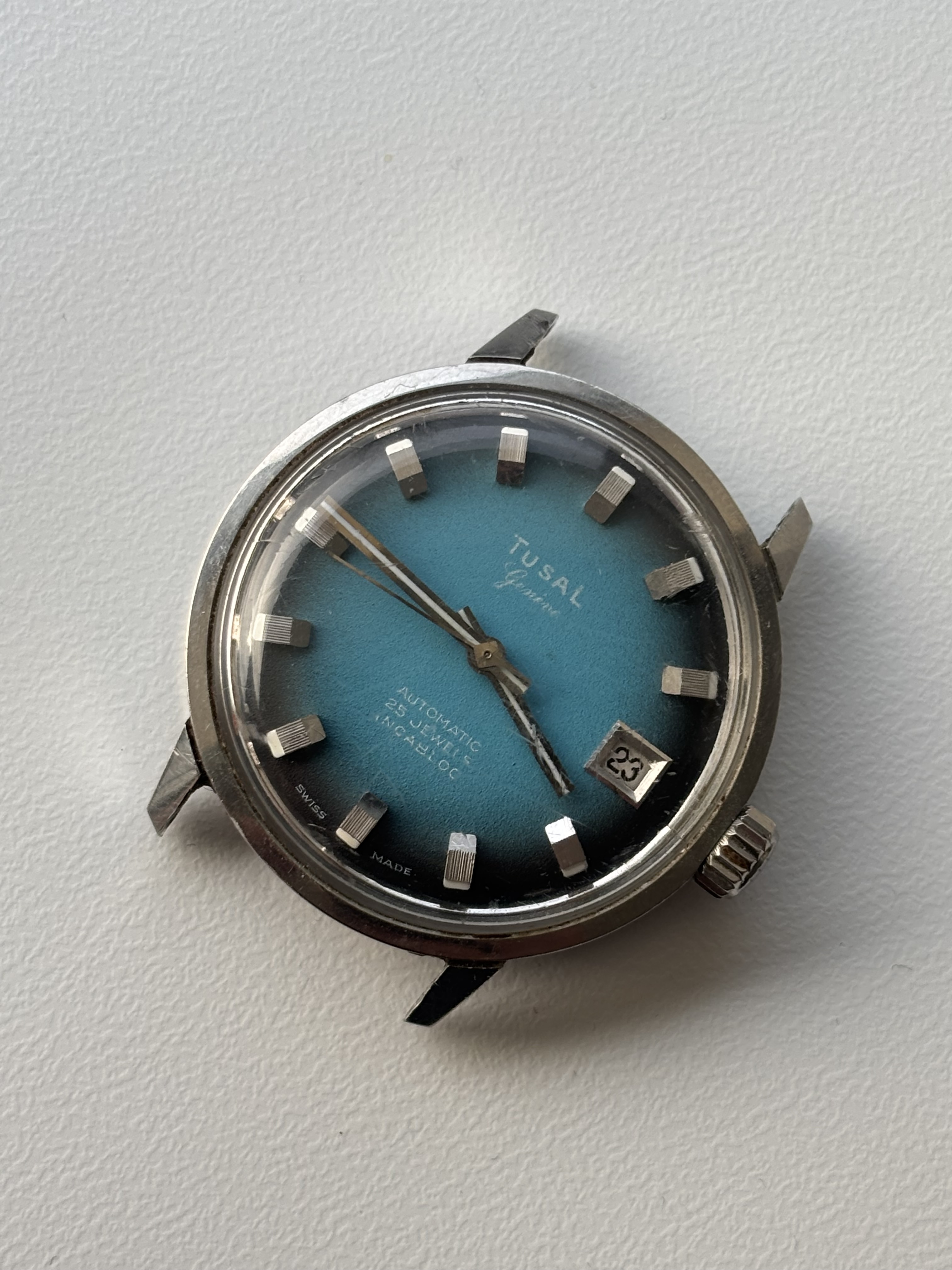 Eén van de horloges viel mij op door zijn bijzondere plaat, namelijk deze Tusal. Het horloge loopt niet en ik ben benieuwd of er hier hobbyisten zijn die het leuk vinden (uiteraard tegen een vergoeding) dit stukje geschiedenis voor mij weer aan de loop te maken!