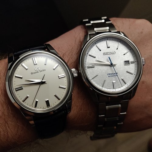 Links is de Grand Seiko SBGW231 (handopwinder) en rechts de Seiko SJE073 (gelimiteerd tot 1881 met GS afwerking en lekker plat