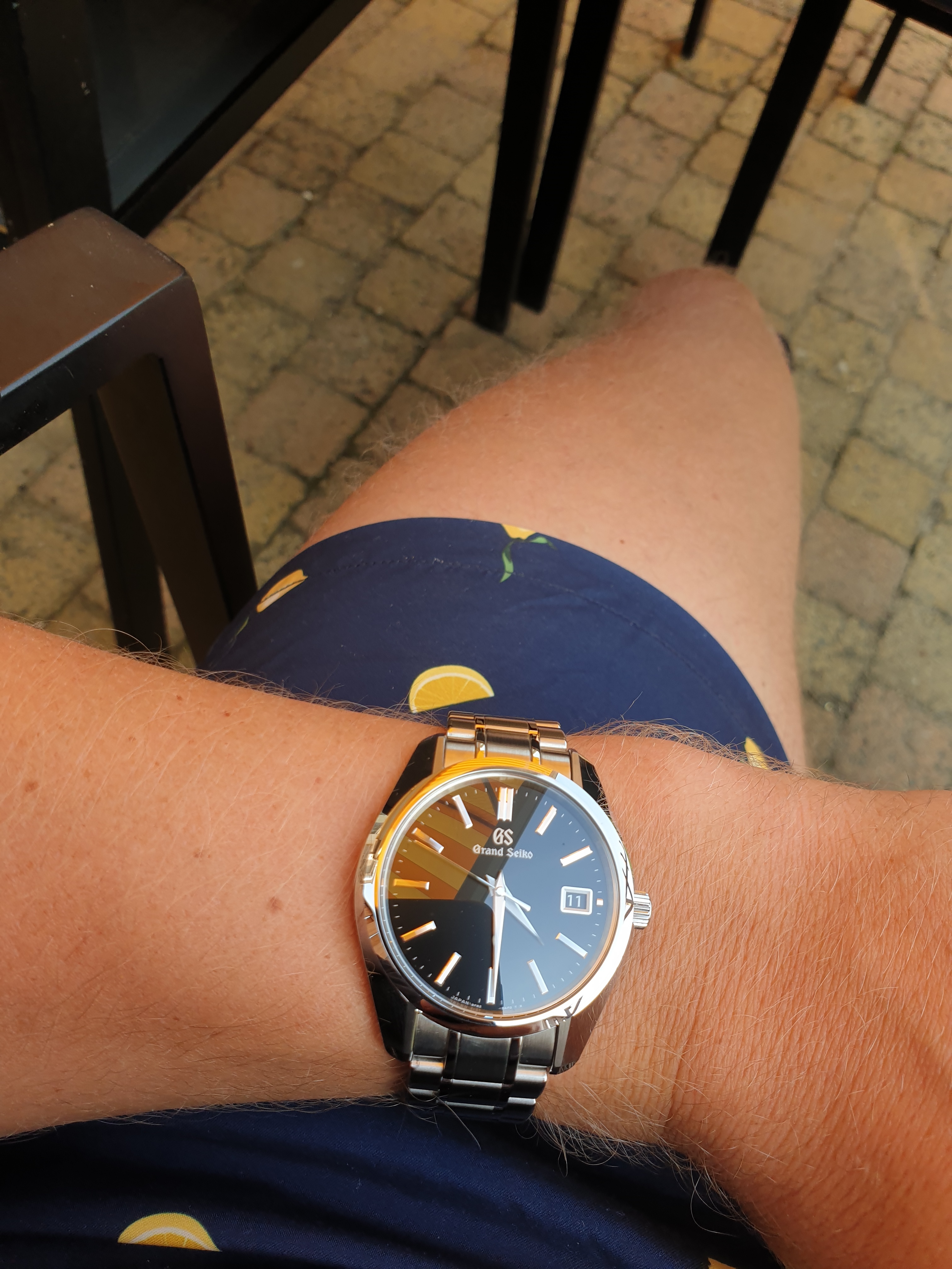 Ik zie het alleen al aan deze SBGH. Gewoon binnen: mwah, zwart grijze plaat, beetje blauwzweem. Lichtstraal: Knal! Sunburst, blauwe kleurflard, sprankeling van indices en wijzers. En weer terug onder de mouw, een gewoon klokkie met een kastvorm en polijstwerk dat je weer een keer extra laat kijken.